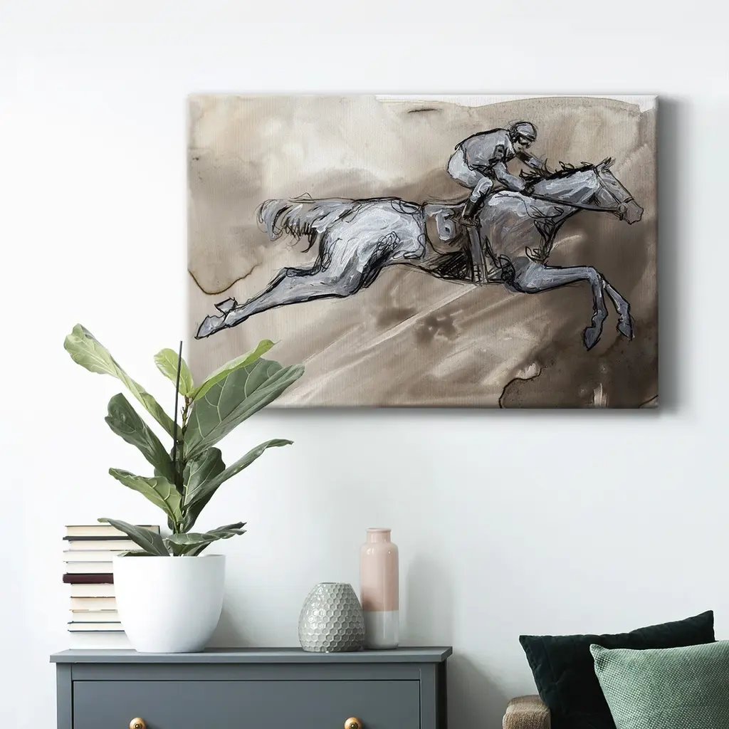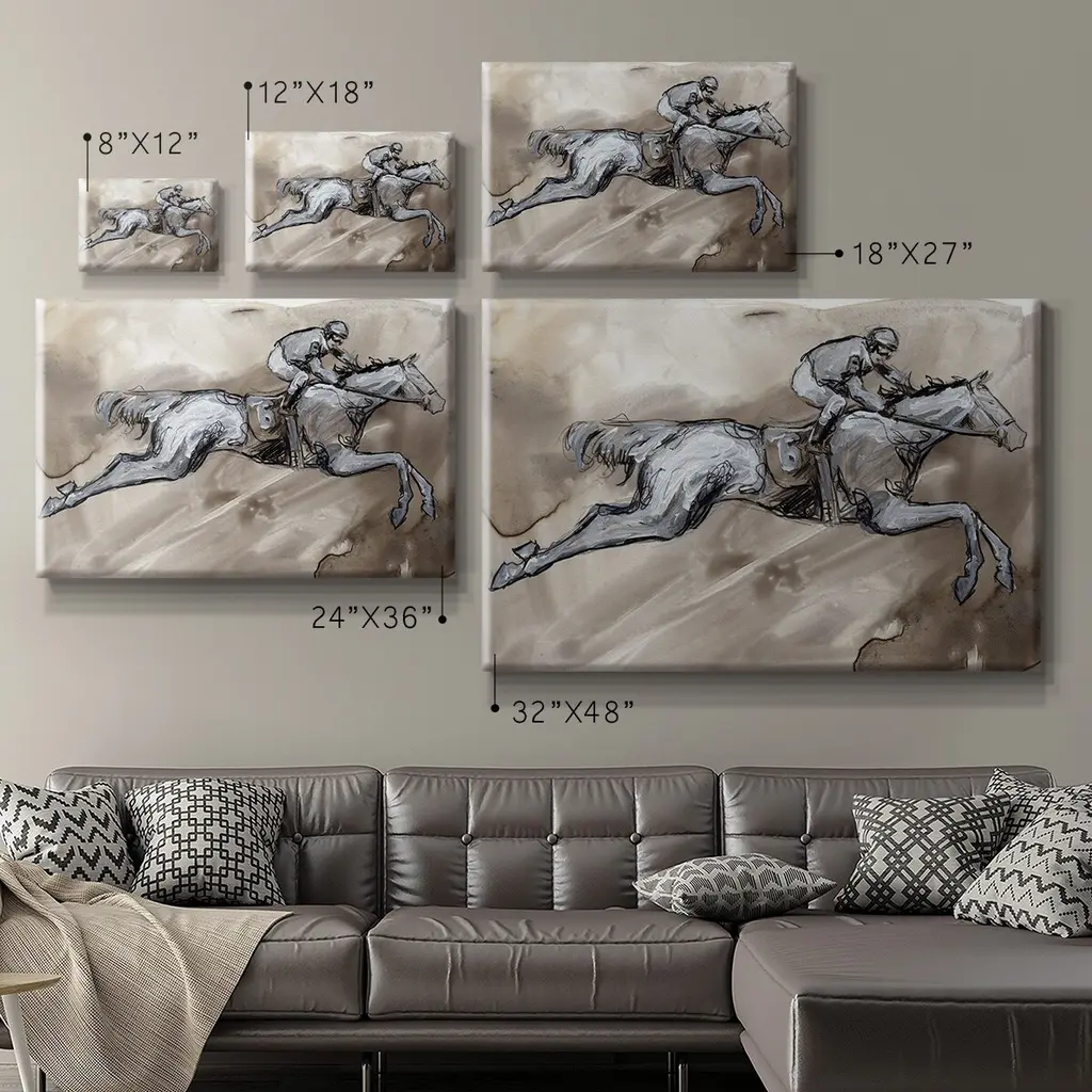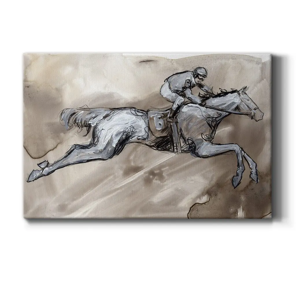 Off to the Races II Premium Gallery Wrapped Canvas - Ready to Hang A premium hand stretched gallery wrapped canvas print created to last. Featuring a beveled a solid wood stretcher bar, each piece comes ready to hand 6 SIZES AVAILABLE 8''X12'' - Overall Size 12''X18'' - Overall Size 18''X27'' - Overall Size 24''x36'' - Overall Size 32''x48'' - Overall Size 40''x60'' - Overall Size Each piece is made to order. Built to Last Each piece comes ready to hang Solid wood stretcher Fade and Water resistant Made domestically