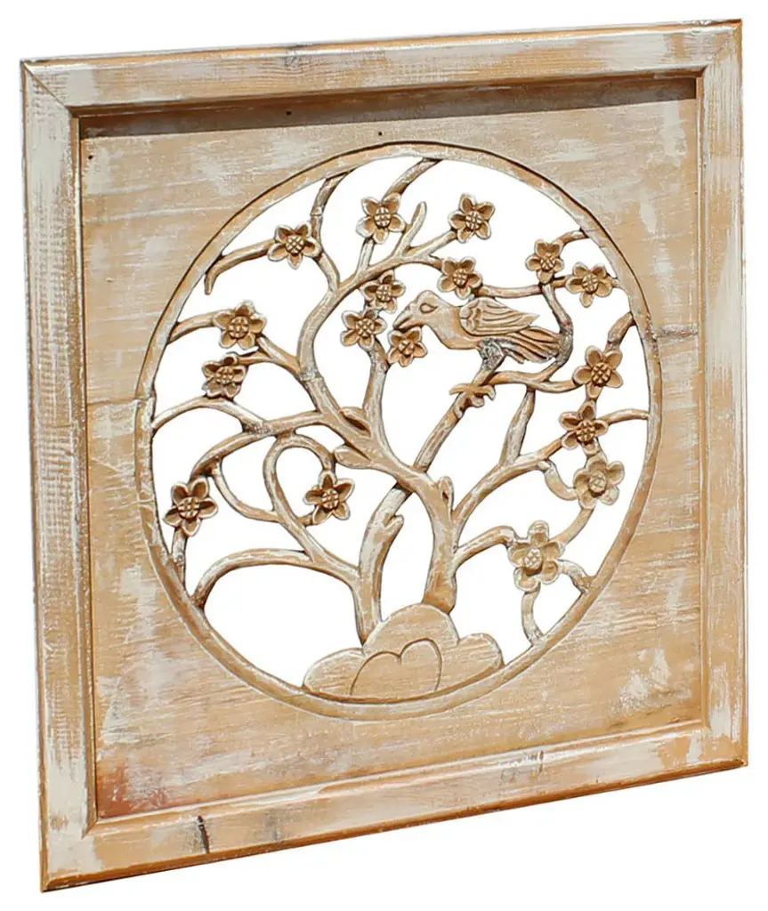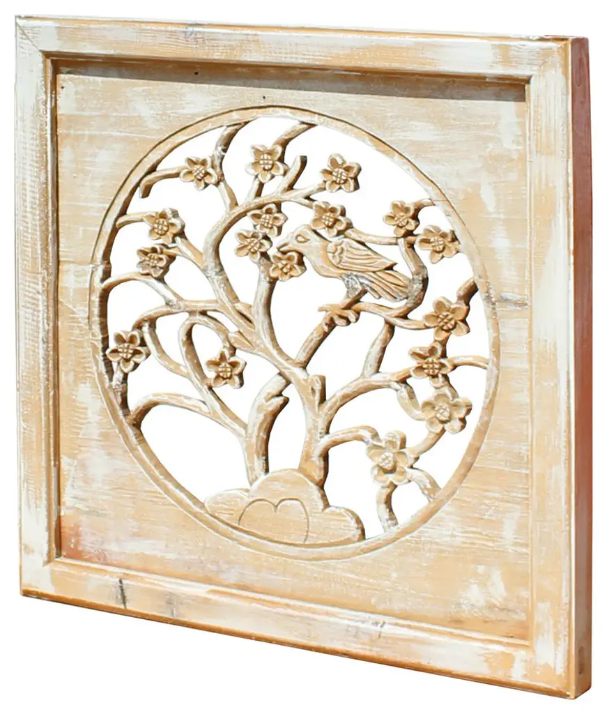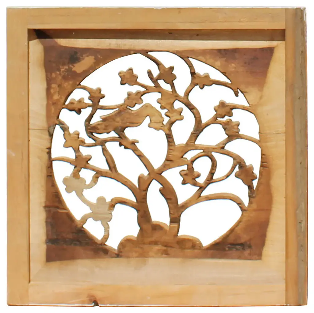 This is a Chinese vintage wash off lacquer finish wooden panel. There is dimensional see through carving motif of flower and bird as the theme.Dimensions: 21.5"x 21.5" x 2" thickness Origin: China Material: Wood Condition: Rustic as it Era: recent made2010sRustic