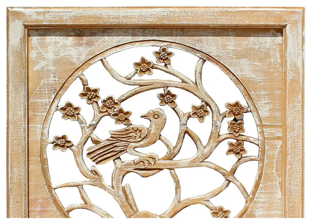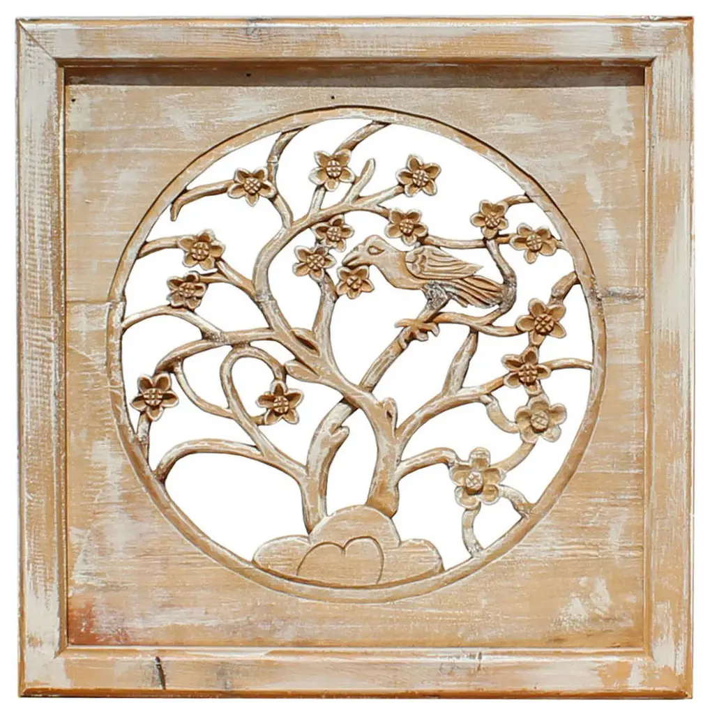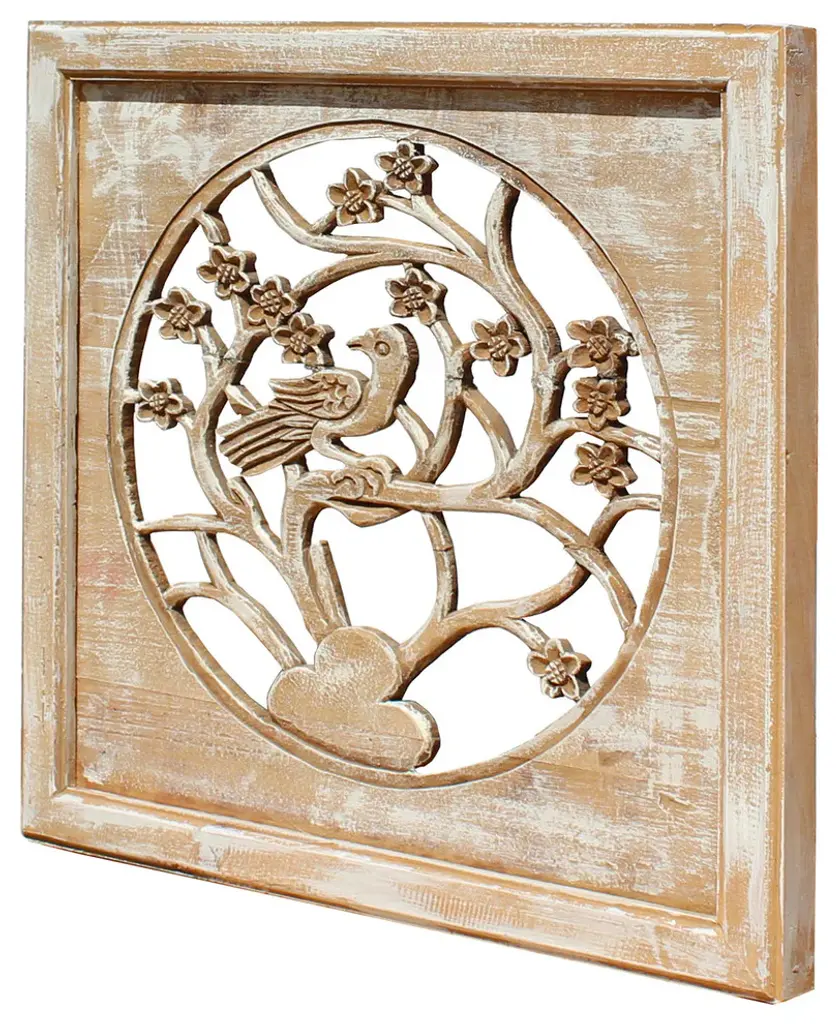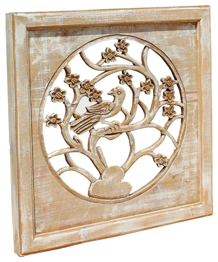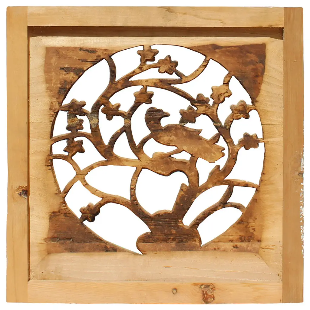 This is a Chinese vintage wash off lacquer finish wooden panel. There is dimensional see through carving motif of flower and bird as the theme.Dimensions: 21.5"x 21.5" x 2" thickness Origin: China Material: Wood Condition: Rustic as it Era : recent made 2017 new