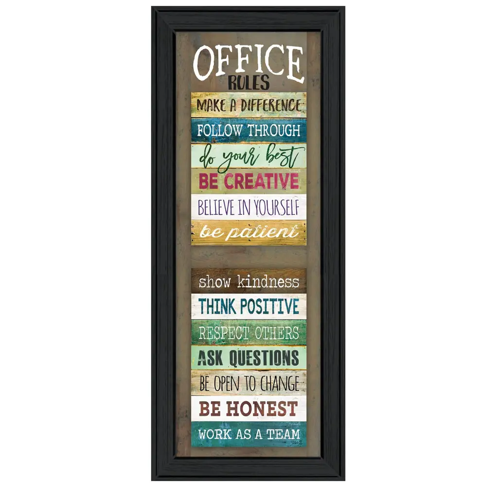 The office rules 1 white framed print wall art is the perfect decorative accessory for your home. This print is a visual artistic expression that allows you to decorate your space in style. Reproduced for you on paper, this hanging decorative accent will be a trendy and fashionable way to dress your walls. Adding this hanging wall art to your space to make your room feel more finished and attractive. Instantly liven up your space with this art that brings color and dimension to your walls. 21" H x 9" W x 1" D