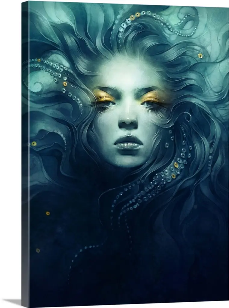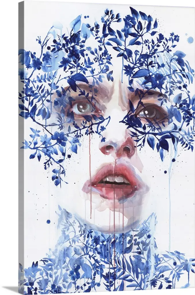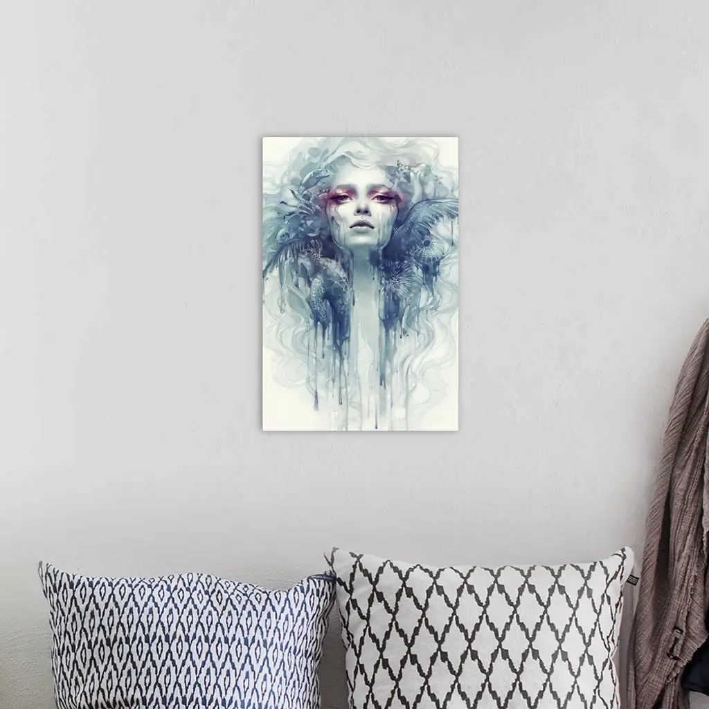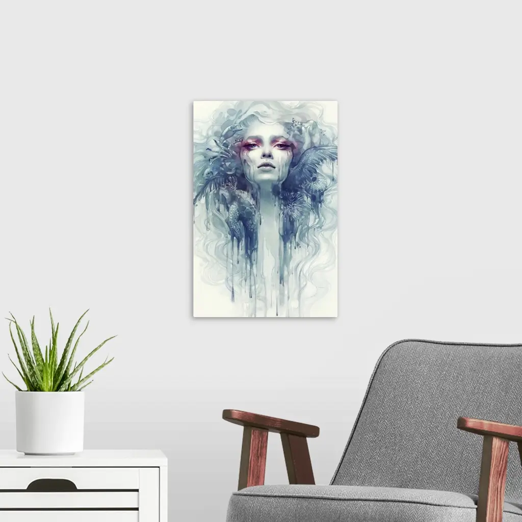 A contemporary fantastical painting of a portrait of a female face with sinuous hair and bird wings on the sides of her head with a dark dripping liquid from the hair.