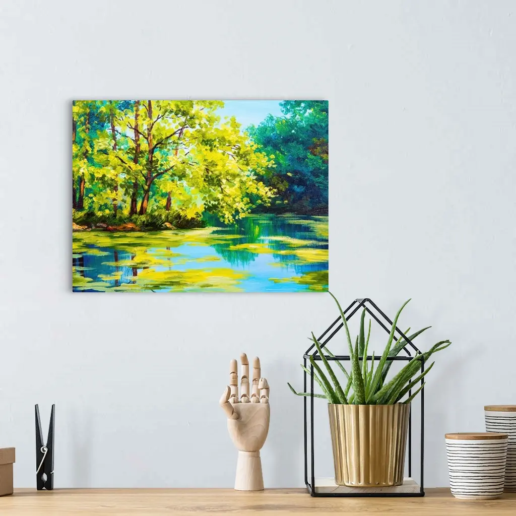 Oil painting of a lake in a forest.