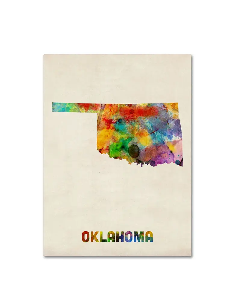 Title: Oklahoma MapArtist: Michael TompsettProduct Type: Canvas ArtSize: 35" x 47"Made in the USA.Art and design were always Michael's favorite subjects at school. He was fortunate to land a job as a graphic designer at one of London's most prestigious publishing companies. After 12 years Michael Tompsett made the decision to pursue a full-time career creating his own work. The freedom and time to be able to focus solely on his own projects has been a wonderful experience. Although Michael likes to experiment with different styles and subjects, his main focus is on map art. He enjoys looking for unique and interesting ways to depict something familiar. Maps are visual representations of the world we live in, a world which is incredibly diverse. Apart from maps, Tompsett creates urban landmark and cityscape designs.This 35" x 47" canvas art is ready to hang. Giclee (jee-clay) is an advanced printmaking process for creating high quality fine art reproductions. The attainable excellence that Giclee printmaking affords makes the reproduction virtually indistinguishable from the original piece. The result is wide acceptance of Giclee by galleries, museums, and private collectors. Gallery wrap is a method of stretching an artist's canvas so that the canvas wraps around the sides and is secured to a hidden, wooden frame. This method of stretching and preparing a canvas allows for a frameless presentation of the finished print.