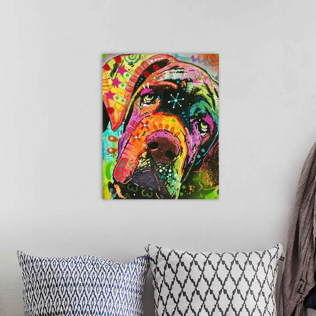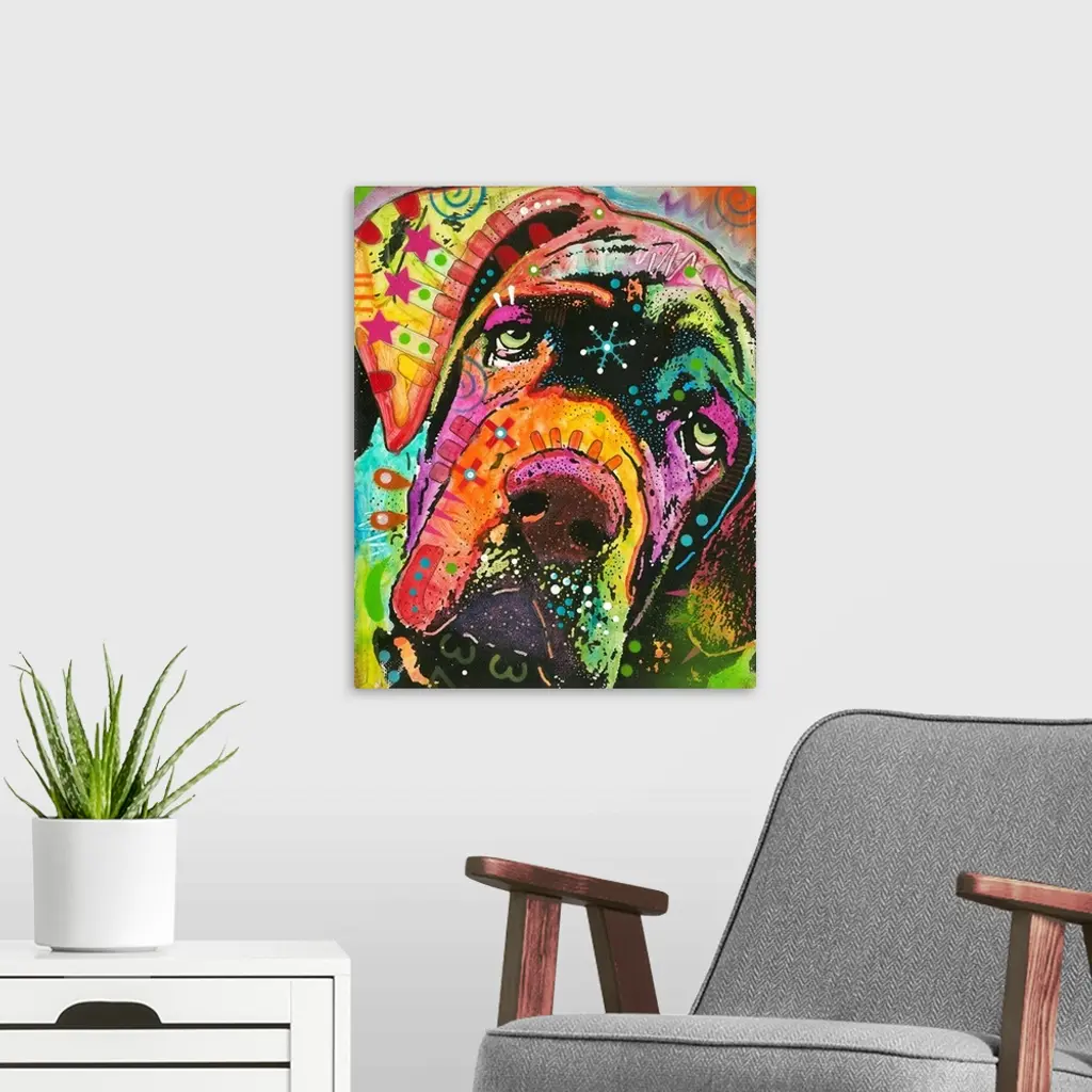 Vibrant painting of droopy faced dog with colorful abstract designs all over.