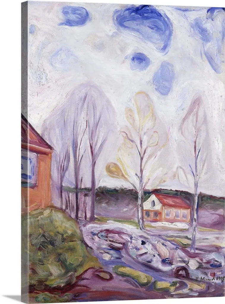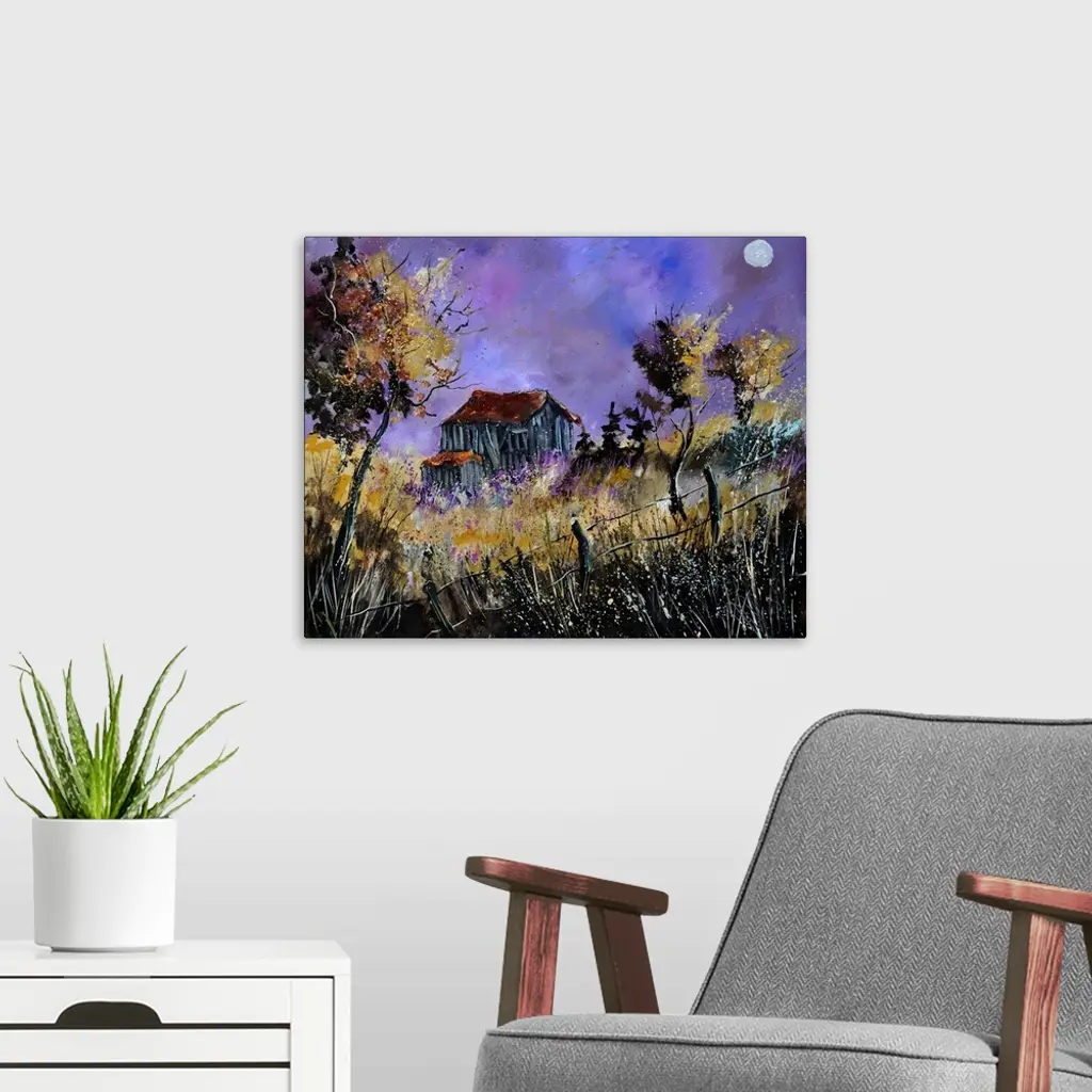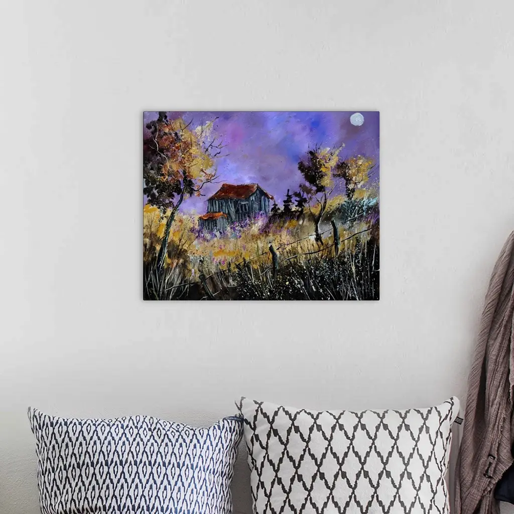 Landscape painting of a weather barn in a field with speckles of paint overlapping.