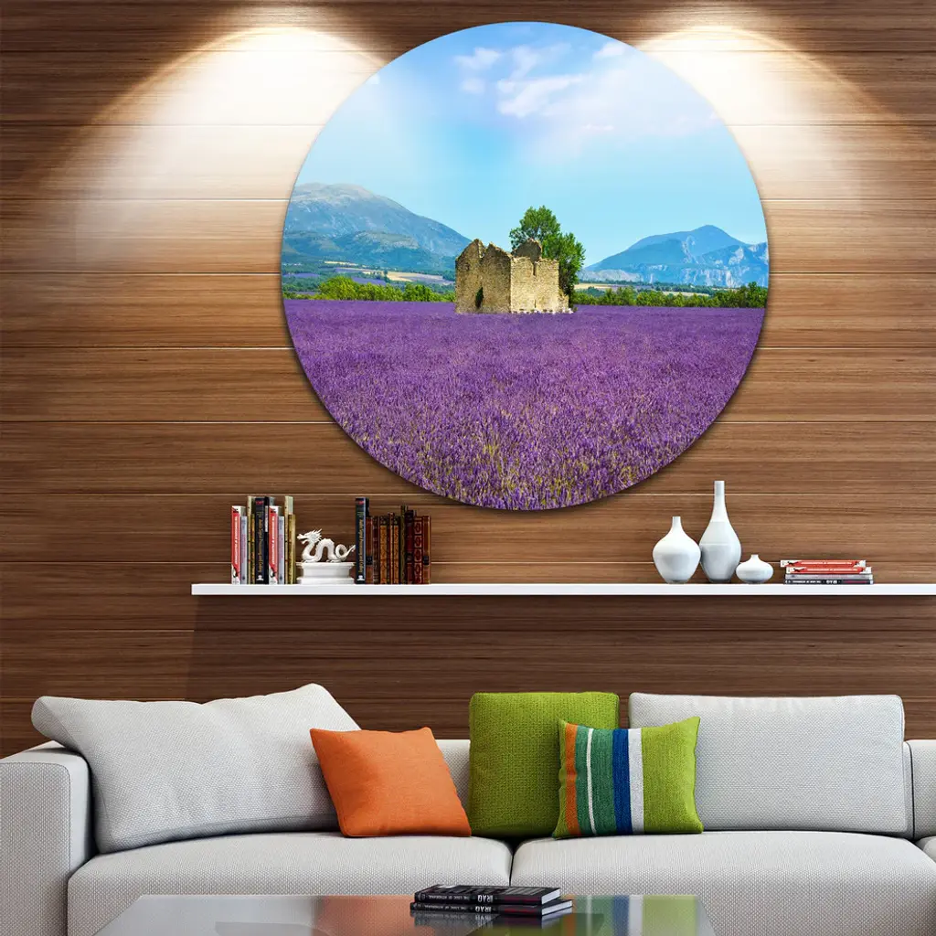 Bring Contemporary Abstraction to your home with this large Circle Metal wall art. This Old House and Tree in Lavender Field Metal Artwork makes it the focal point of any room or office. - White Gloss Coating ensures colors are extra vibrant with light reflection.- Aluminum grade Sheet Metal with 1 inch mounting frame on the back giving the illusion that the artwork is floating on the wall..- Mounting Brackets are included along with instructions.- High Quality Digital images are created directly into a glossy aluminum panel producing a stunning and captivating print into the glossy finish of the metal.- Water, Fire and Scratch resistant HD Aluminum panels.- Looks better than any photo paper and guaranteed to last at least 20 years- Easy to clean with a microfiber cloth. Colors are far superior to regular Canvas Art. - Easy to Hang