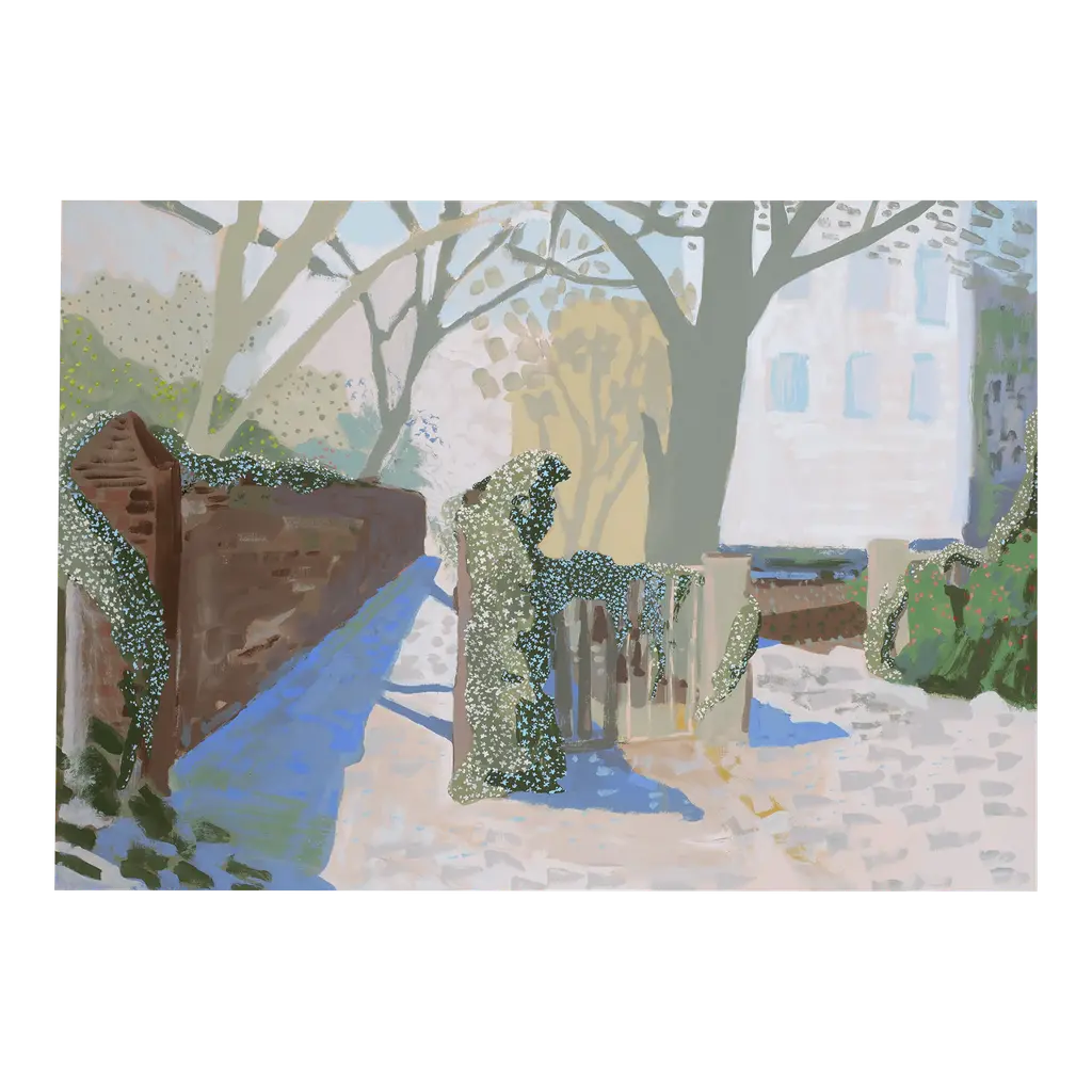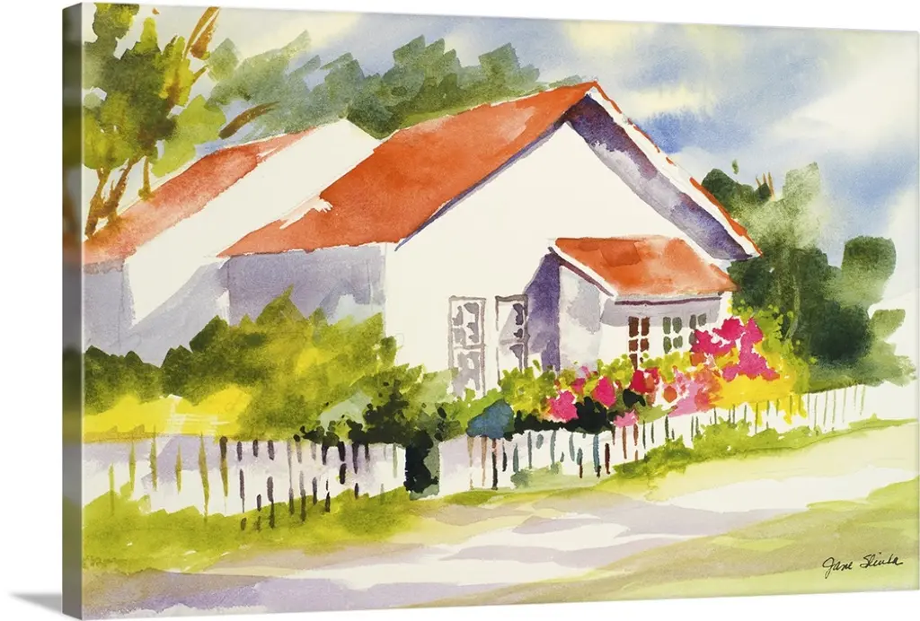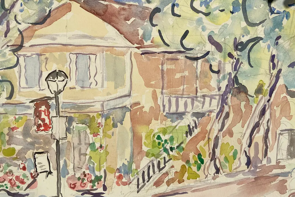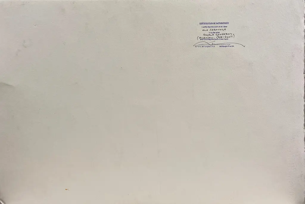 A large, Post-Impressionist style Northern California landscape showing a view of a historic suburban neighborhood. Stamped, verso with Certification of Authenticity for Donald Geoffroy (American, 1908-2007) and painted circa 2000. Geoffroy spent his career painting in Hawai’i and the Saratoga, California area.