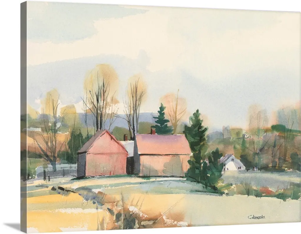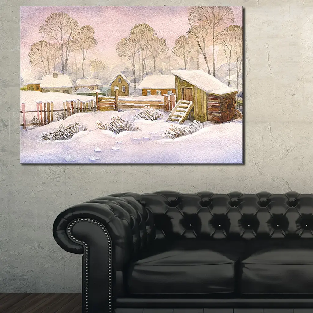"Old Winter Village" Landscape Watercolor Canvas Print, 32"x16"