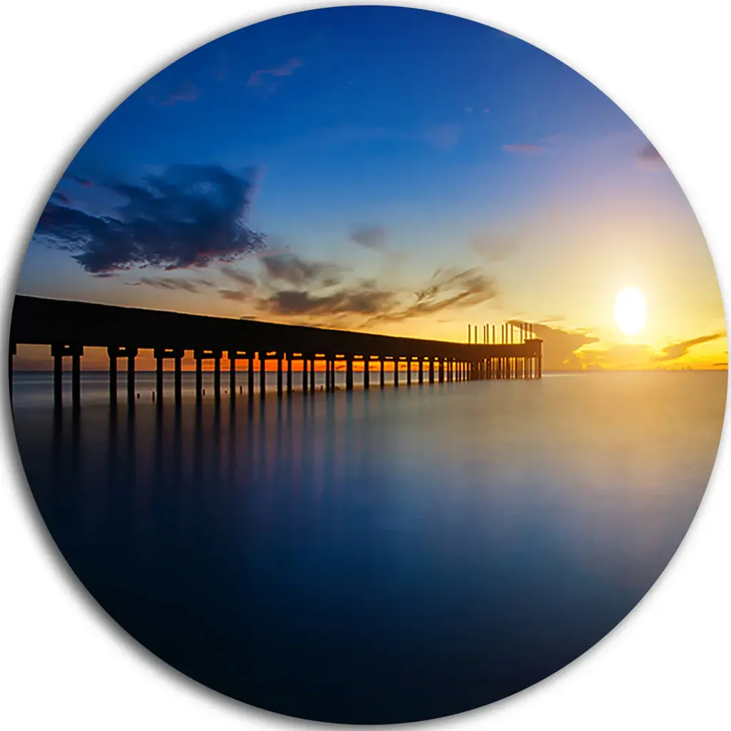 Bring Contemporary Abstraction to your home with this large Circle Metal wall art. This Old Wooden Pavilion in Sea Metal Artwork makes it the focal point of any room or office. - White Gloss Coating ensures colors are extra vibrant with light reflection.- Aluminum grade Sheet Metal with 1 inch mounting frame on the back giving the illusion that the artwork is floating on the wall..- Mounting Brackets are included along with instructions.- High Quality Digital images are created directly into a glossy aluminum panel producing a stunning and captivating print into the glossy finish of the metal.- Water, Fire and Scratch resistant HD Aluminum panels.- Looks better than any photo paper and guaranteed to last at least 20 years- Easy to clean with a microfiber cloth. Colors are far superior to regular Canvas Art. - Easy to Hang