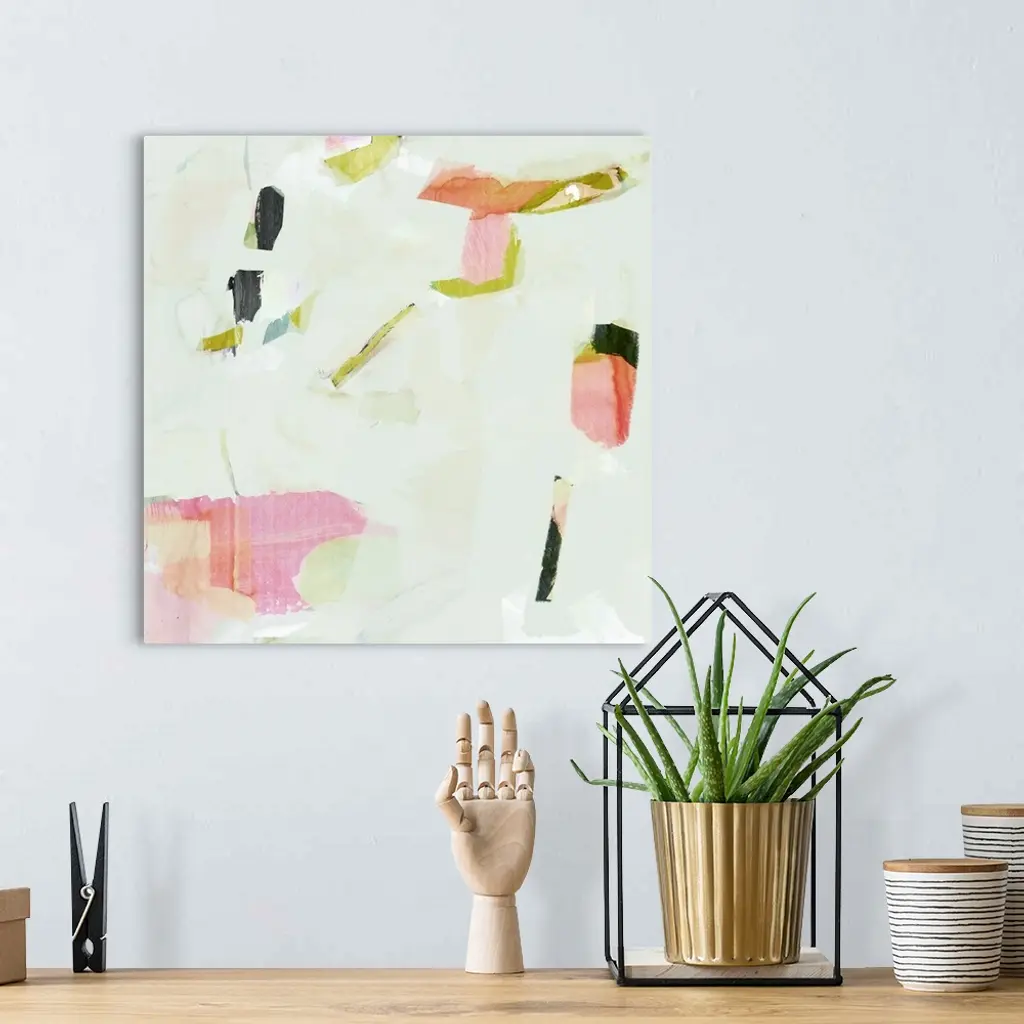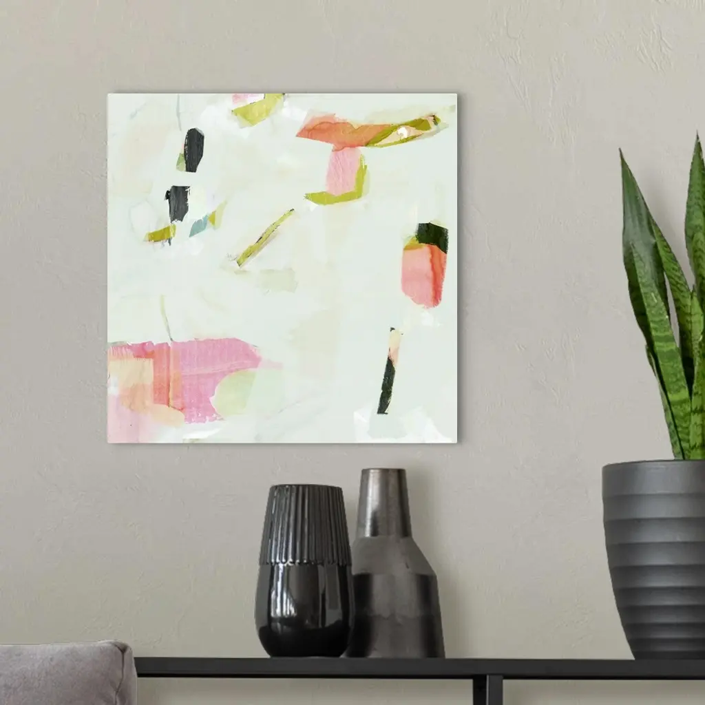This abstract artwork features scattered pops of pink, orange and green against a soft green background that evokes the feeling of summer.
