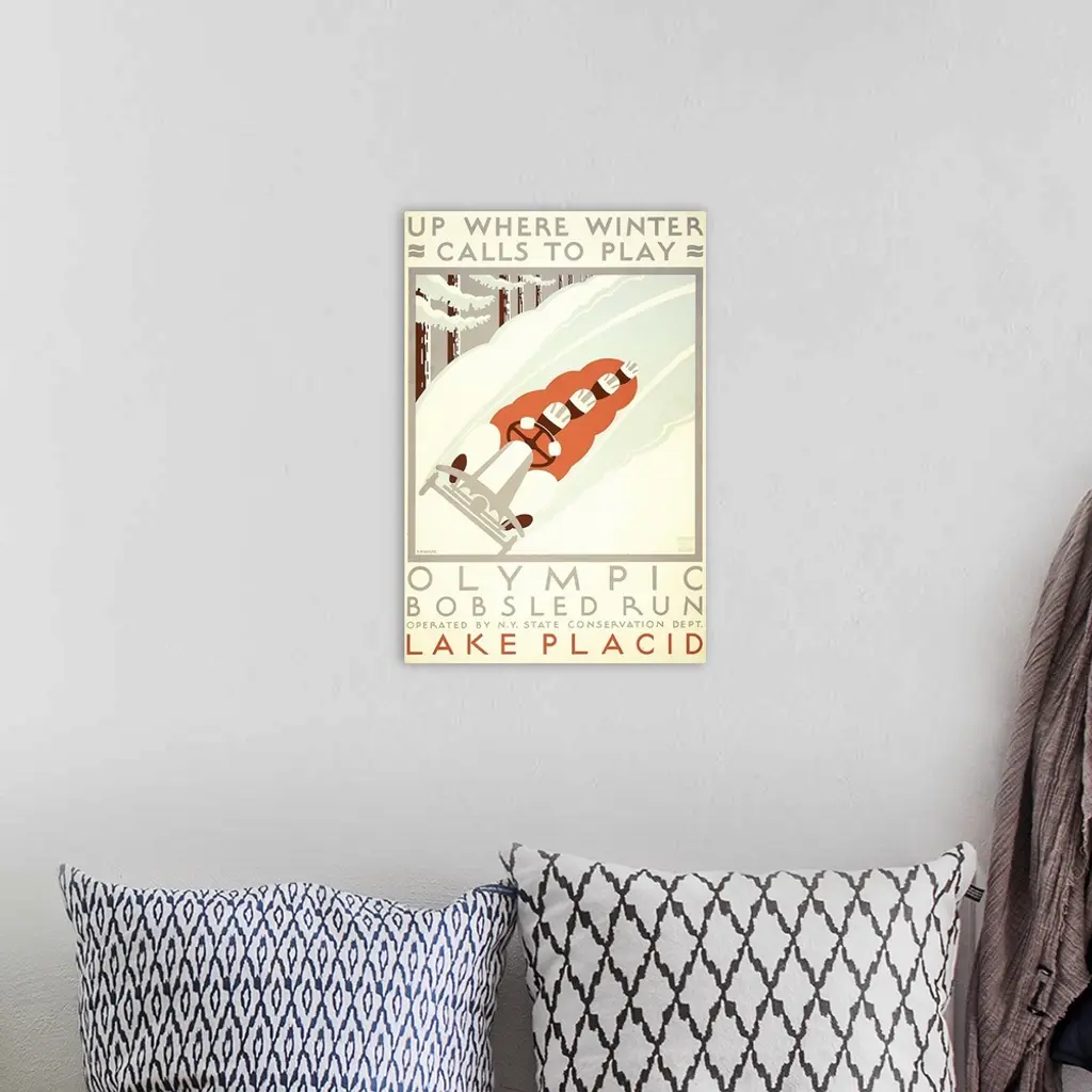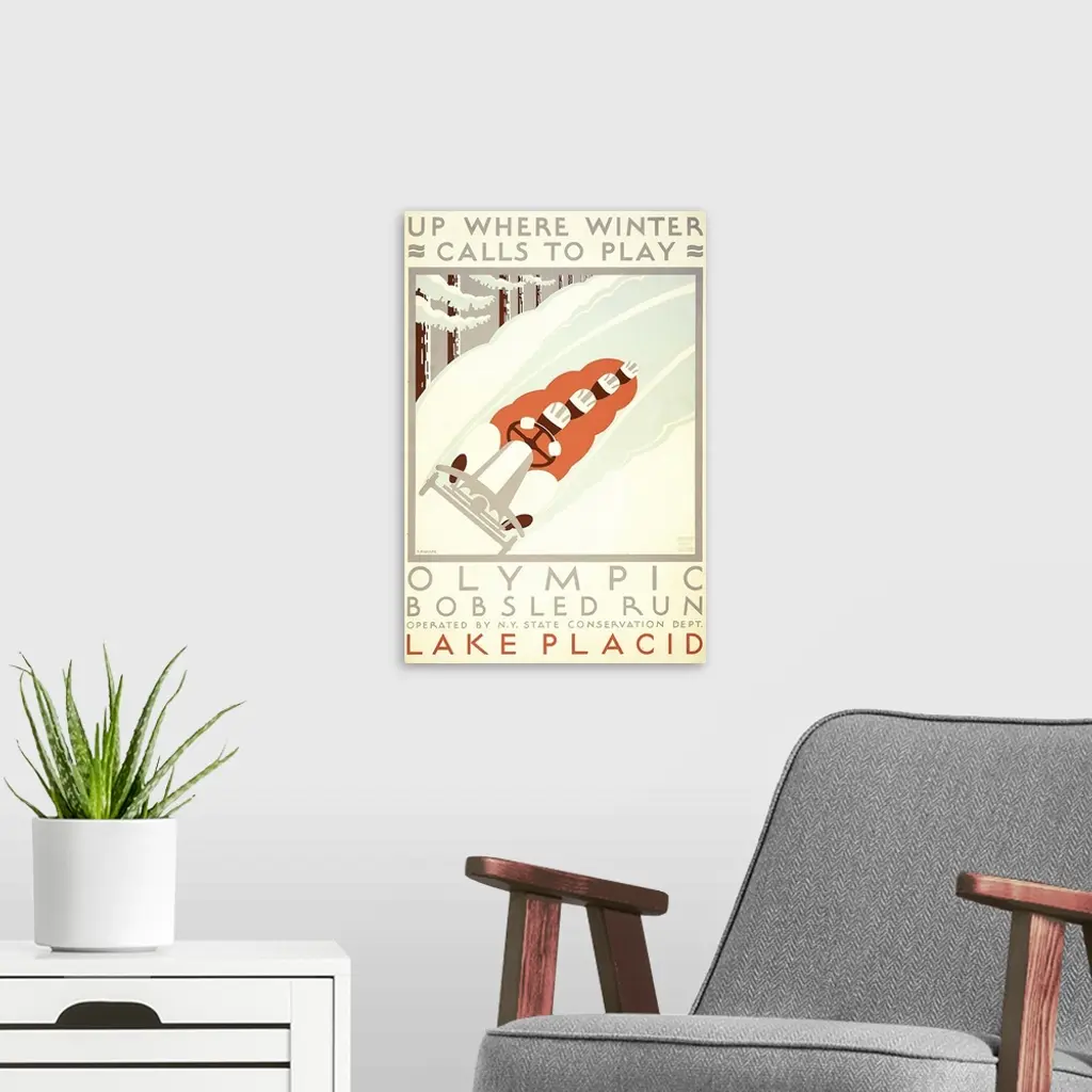 Up where winter calls to play. Olympic bobsled run, Lake Placid. Poster promoting winter sports, showing four people in bobsled. Library of Congress, Prints and Photographs Division, WPA Poster Collection.