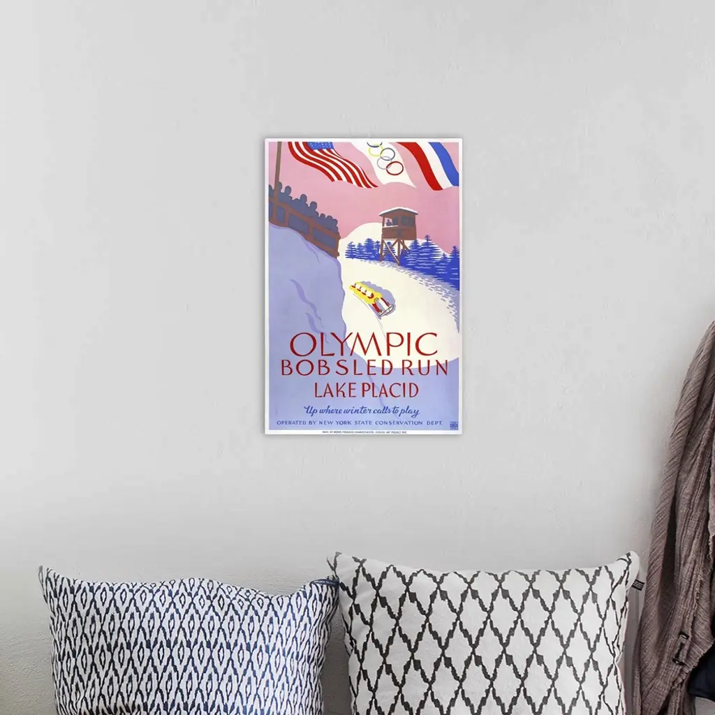 Olympic bobsled run, Lake Placid. Up where winter calls to play. Poster promoting winter sports, showing four man bobsledding on bobsled run. Library of Congress, Prints and Photographs Division, WPA Poster Collection.