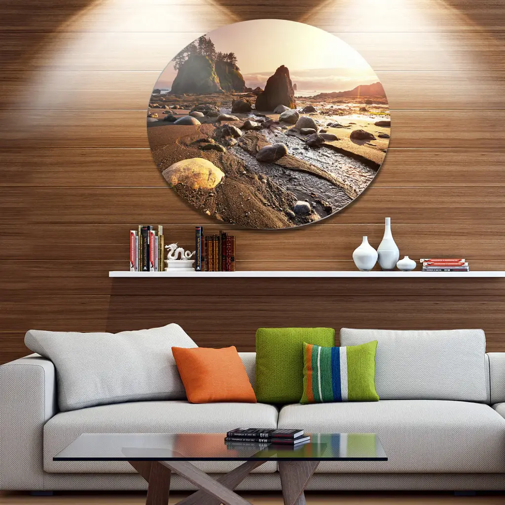 Bring Contemporary Abstraction to your home with this large Circle Metal wall art. This Olympic National Park Coast Metal Artwork makes it the focal point of any room or office. - White Gloss Coating ensures colors are extra vibrant with light reflection.- Aluminum grade Sheet Metal with 1 inch mounting frame on the back giving the illusion that the artwork is floating on the wall..- Mounting Brackets are included along with instructions.- High Quality Digital images are created directly into a glossy aluminum panel producing a stunning and captivating print into the glossy finish of the metal.- Water, Fire and Scratch resistant HD Aluminum panels.- Looks better than any photo paper and guaranteed to last at least 20 years- Easy to clean with a microfiber cloth. Colors are far superior to regular Canvas Art. - Easy to Hang