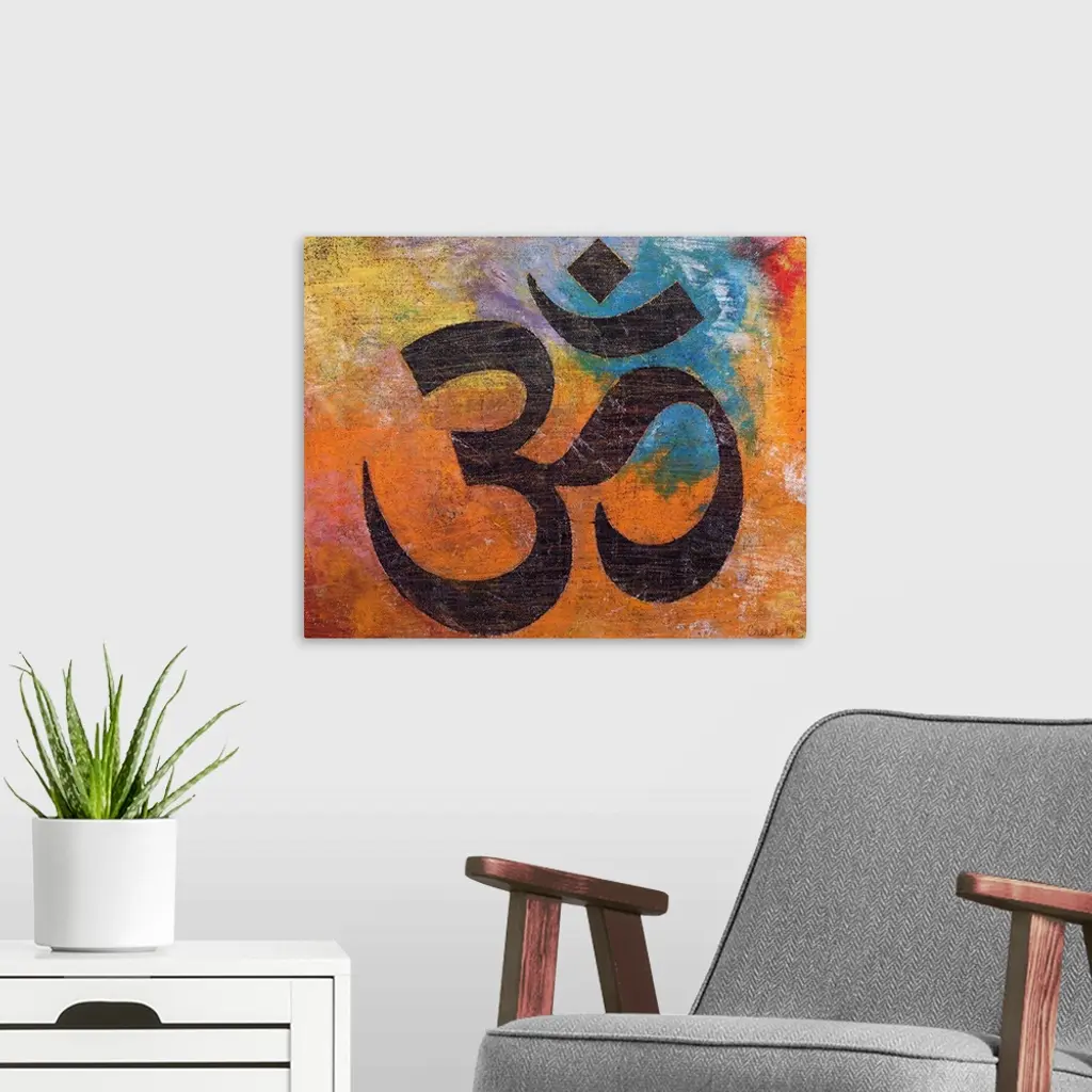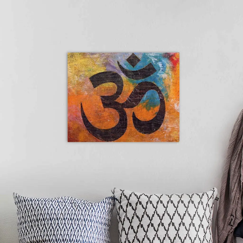 A contemporary painting of an Om against a colorful background.