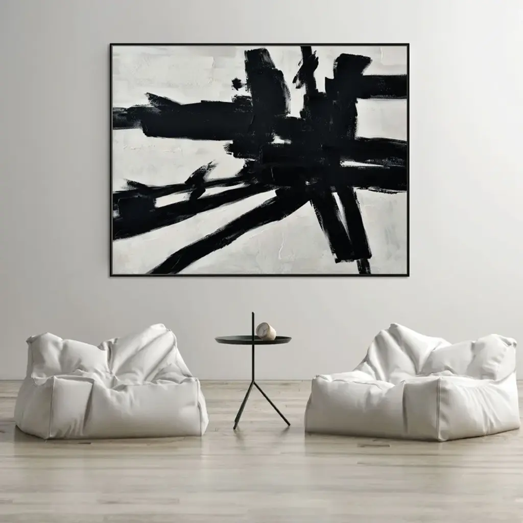 Omaggio a Kline is a large abstract painting hand-painted on canvas. Black brushstrokes of varying thickness interact dynamically on a white background. The color contrast produces a strong visual impact, evoking great emotional energy with bold simplicity. With an inner wooden frame and black wooden frame, the painting is ready to hang.The AGAVE Quadri collection represents the excellence of contemporary art applied to the world of interior design. Each piece, hand-painted with artisanal techniques by the finest artists in collaboration with the Italian company AGAVE, combines abstract, natural, and figurative elements to create unique and refined works. These paintings transform spaces into environments of great elegance and character, perfect for interior design projects that require a distinctive and artistic touch.