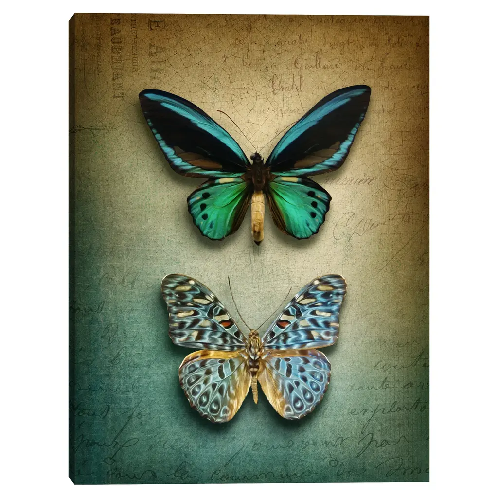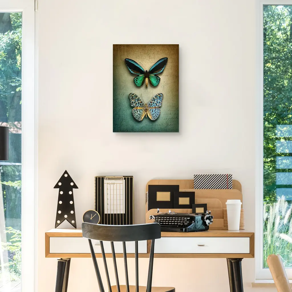 Two butterflies lay pinned at the center of this canvas. Their wings are splayed to allow the viewer a closer look at their iridescent green and blue colors, which stand out against a tan and blue ombre background. Produced with full-bleed printing that covers the entirety of the canvas, your new masterpiece is made with state-of-the-art technology that provides museum-quality prints. Our print process ensures each piece is produced to showcase the finest details, letting the artwork truly shine. Plus, our expert craftsmanship guarantees a clean and professional look without the need for framing.
