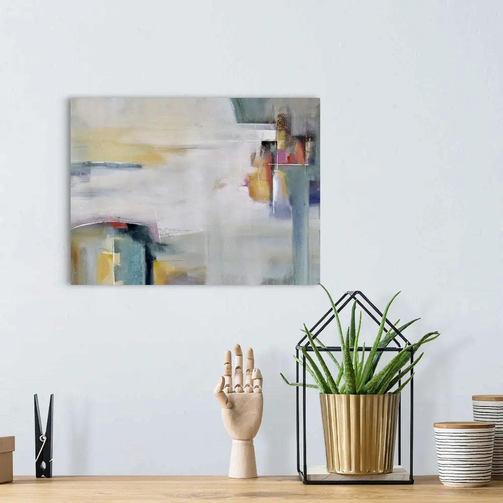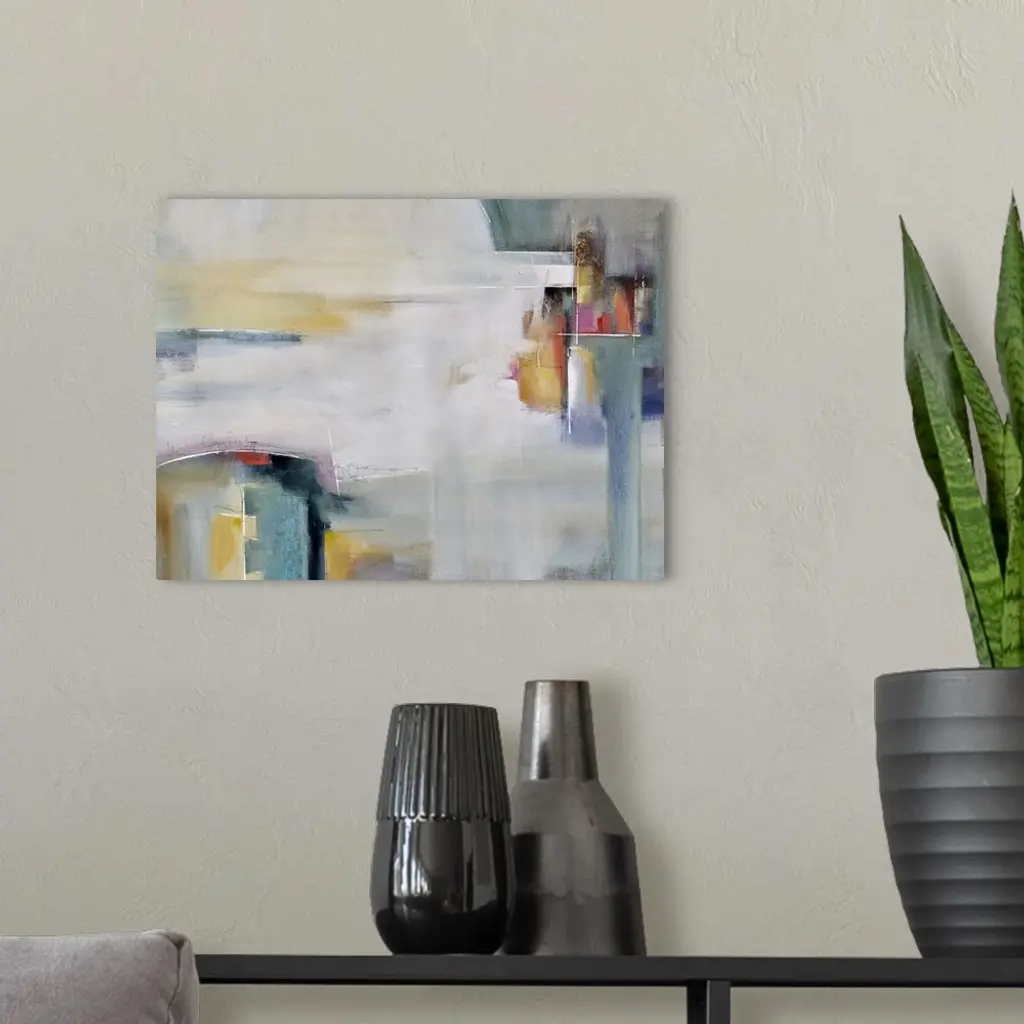 Contemporary abstract artwork in white and grey, with pops of yellow and red.