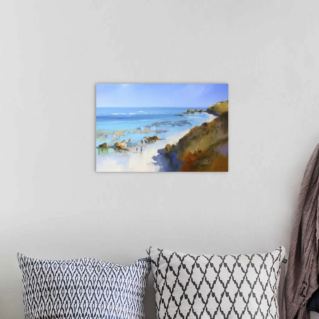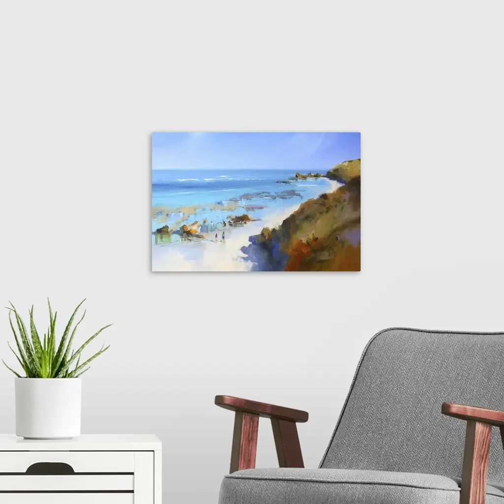 Contemporary painting of hills along a sandy beach off the Italian coast.