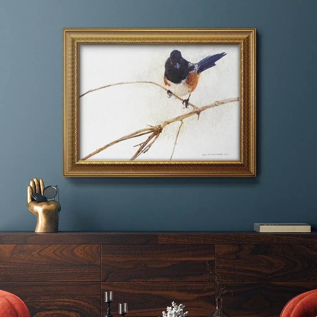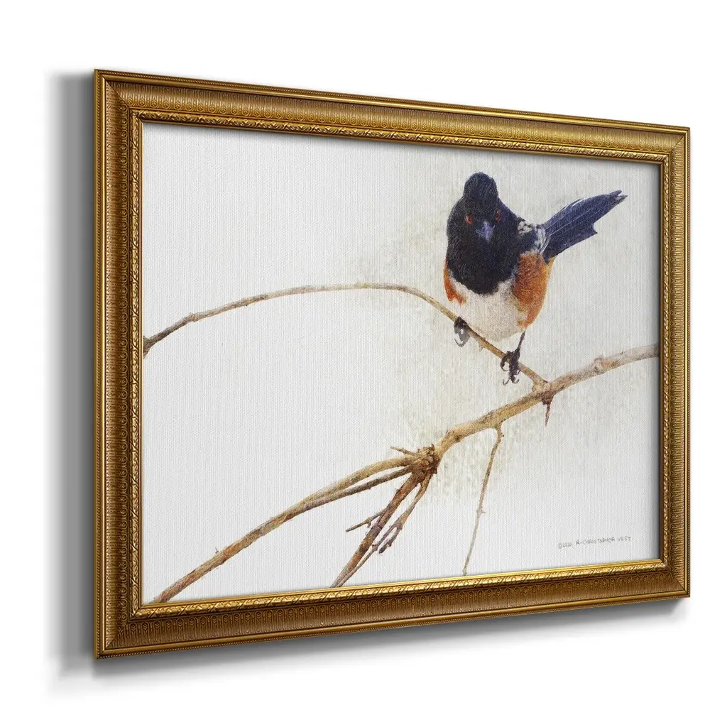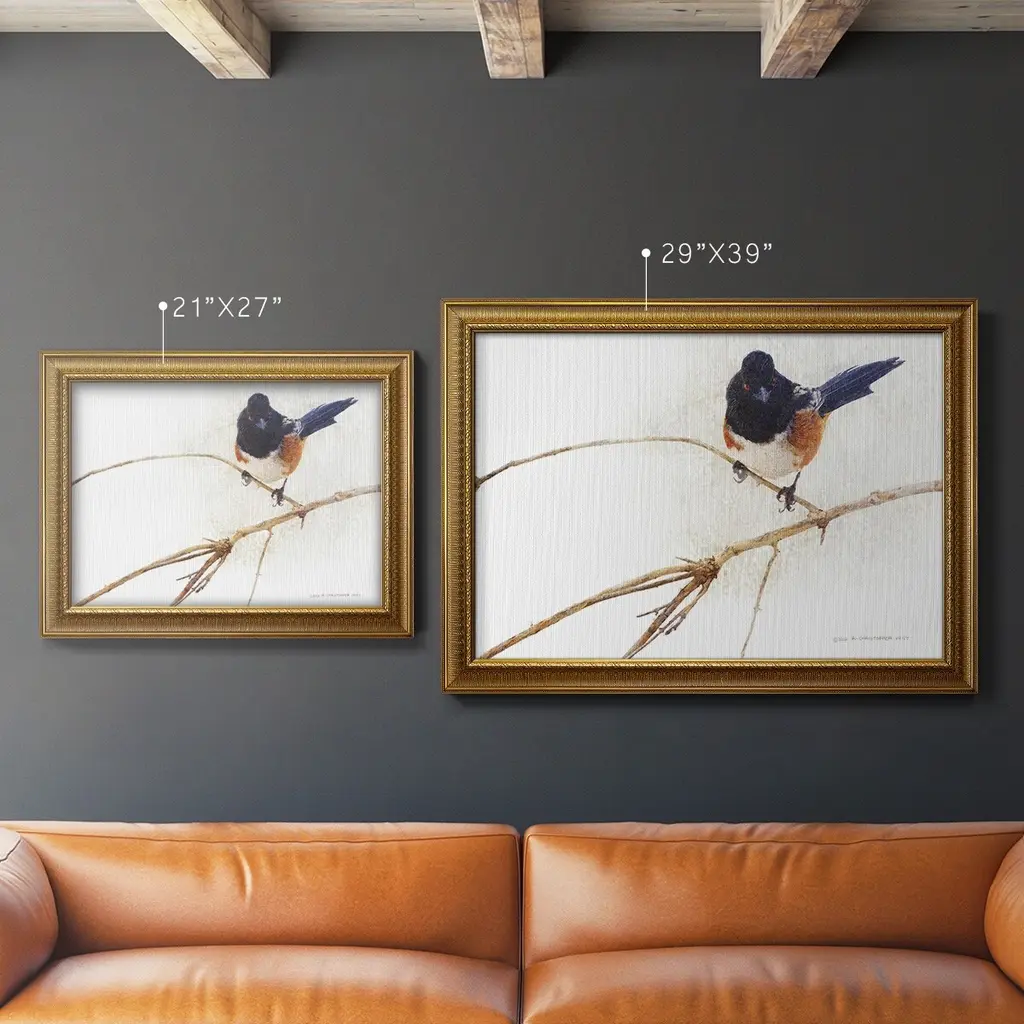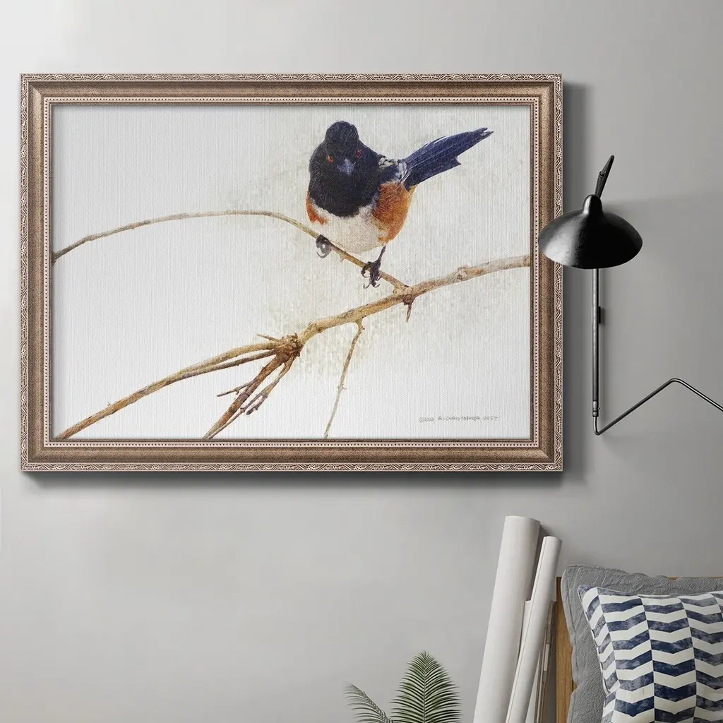 On the Branch IV Premium Framed Canvas- Ready to Hang A Premium Framed Canvas created to last. Framed in distressed wood and available in an array of sizes and colors Featuring a beveled a solid wood stretcher bar, each piece comes ready to hand 3 SIZES AVAILABLE 16''X20'' - Overall Size 18'X27'' - Overall Size 24''x36'' - Overall Size Each piece is made to order. Each piece comes with hanging hardware. Made in the USA Ready to Hang Giclee Paper Print Acrylic Glass Beveled Matt Board