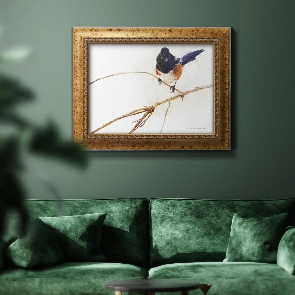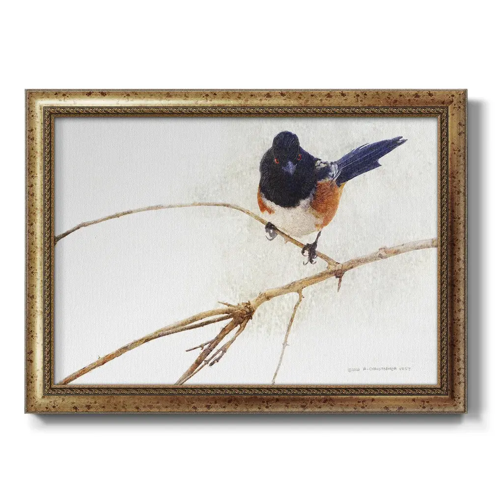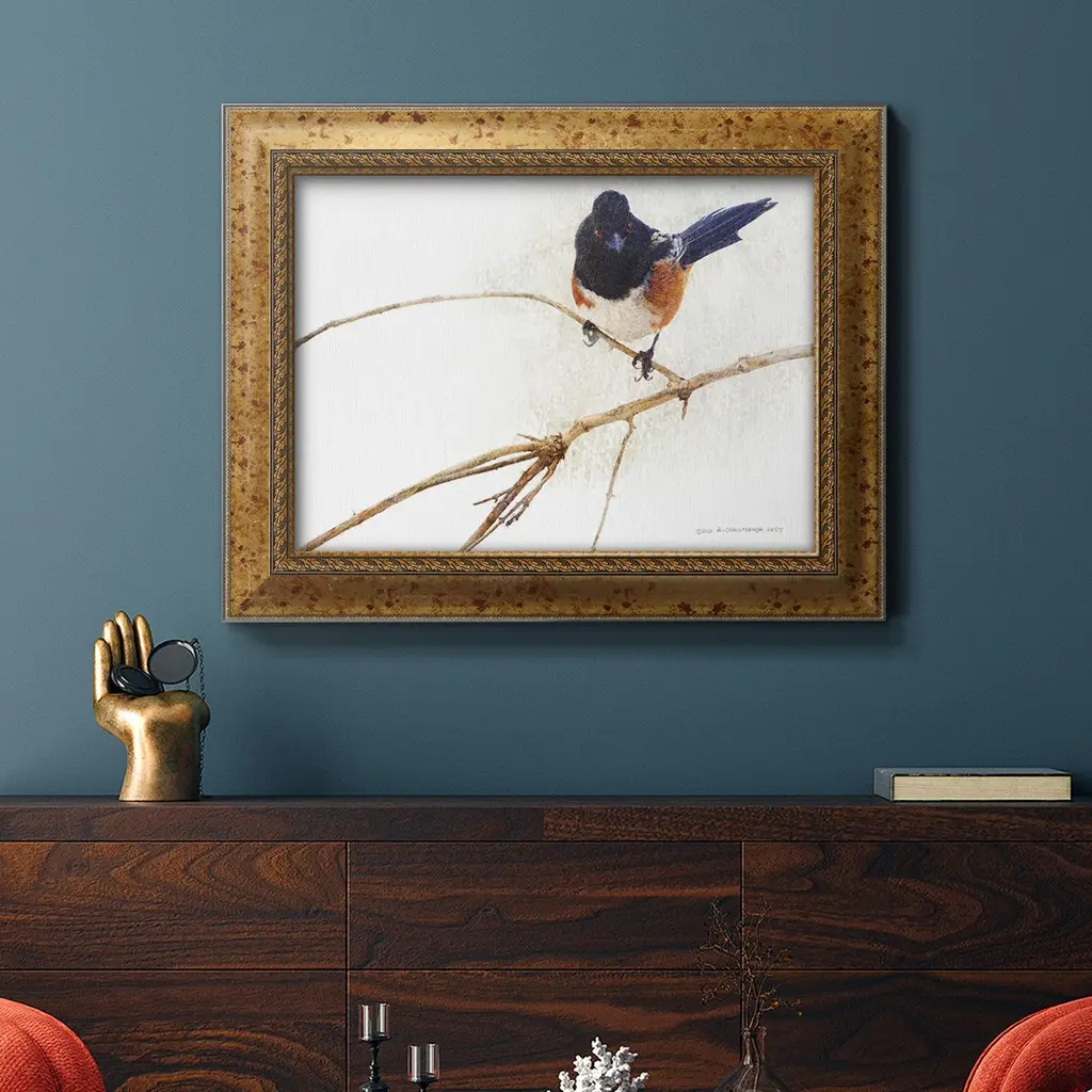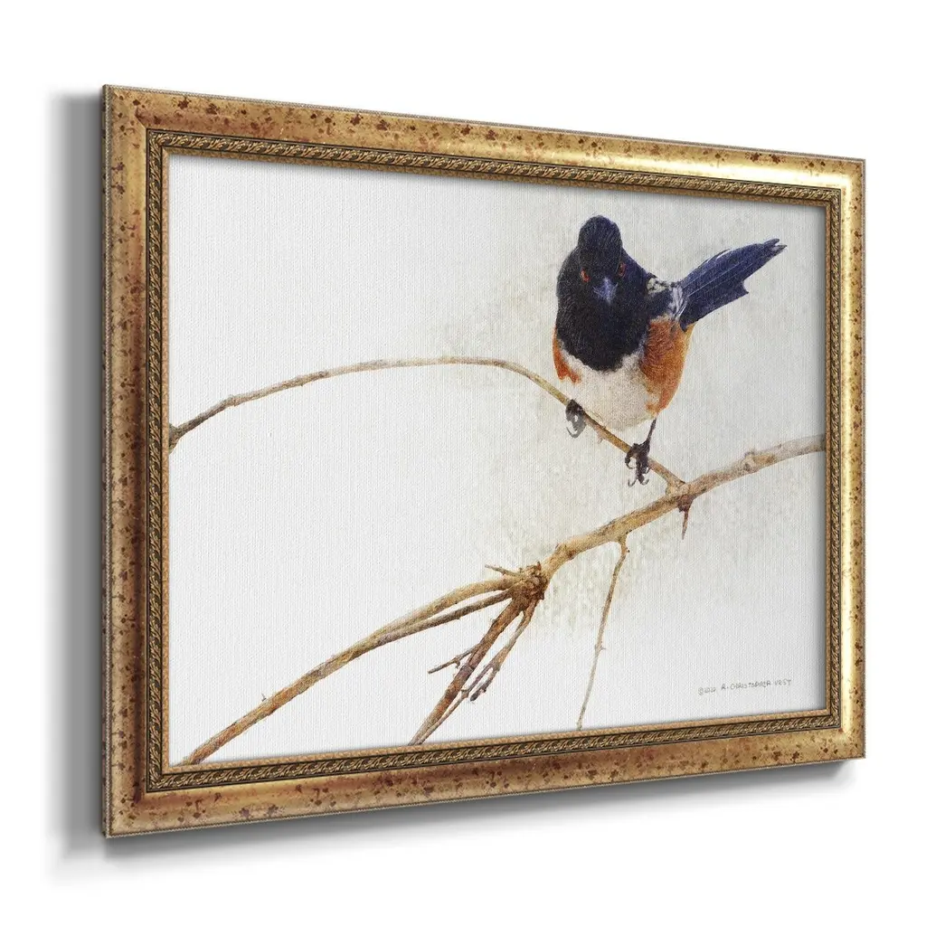 On the Branch IV Premium Framed Canvas- Ready to Hang A Premium Framed Canvas created to last. Framed in distressed wood and available in an array of sizes and colors Featuring a beveled a solid wood stretcher bar, each piece comes ready to hand 3 SIZES AVAILABLE 16''X20'' - Overall Size 18'X27'' - Overall Size 24''x36'' - Overall Size Each piece is made to order. Each piece comes with hanging hardware. Made in the USA Ready to Hang Giclee Paper Print Acrylic Glass Beveled Matt Board