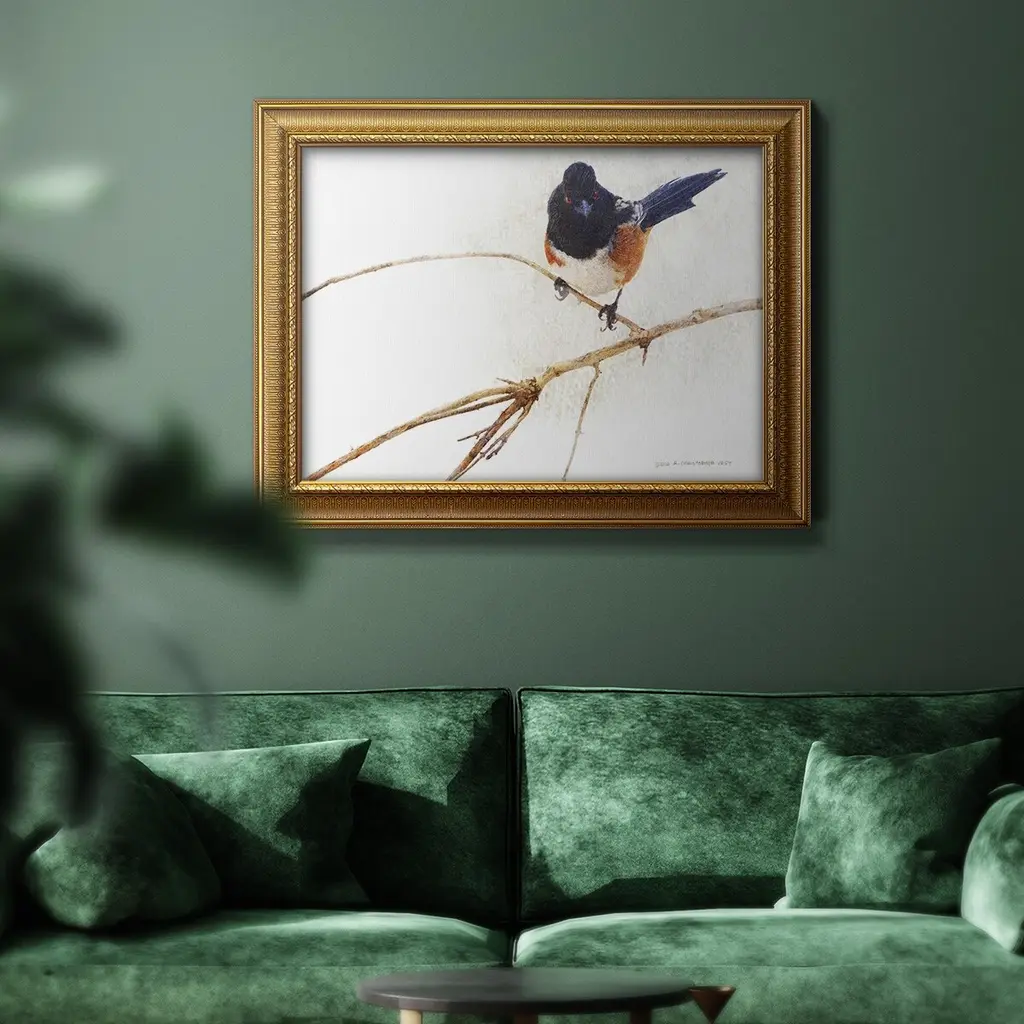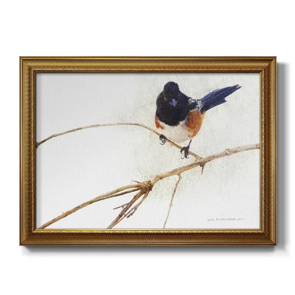 On the Branch IV Premium Framed Canvas- Ready to Hang A Premium Framed Canvas created to last. Framed in distressed wood and available in an array of sizes and colors Featuring a beveled a solid wood stretcher bar, each piece comes ready to hand 3 SIZES AVAILABLE 16''X20'' - Overall Size 18'X27'' - Overall Size 24''x36'' - Overall Size Each piece is made to order. Each piece comes with hanging hardware. Made in the USA Ready to Hang Giclee Paper Print Acrylic Glass Beveled Matt Board