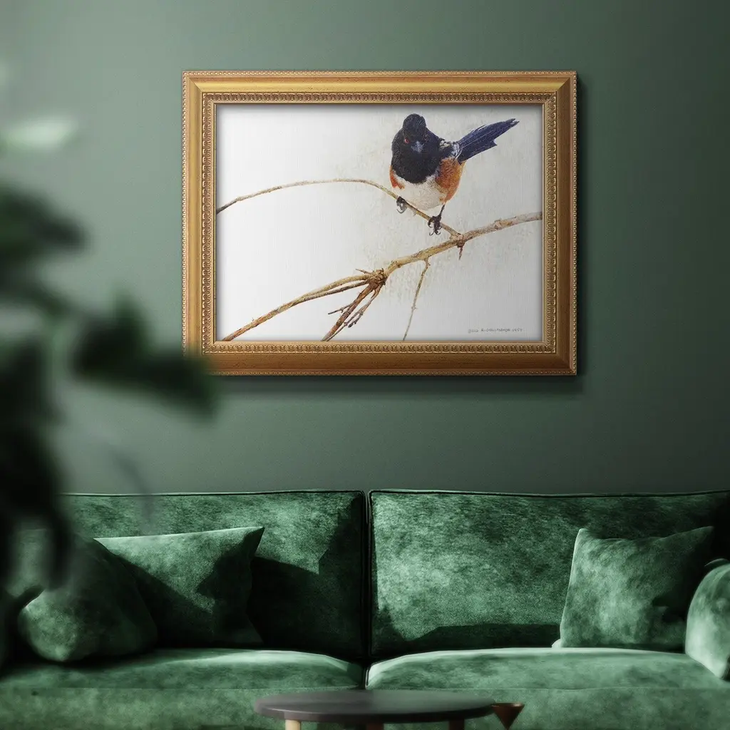 On the Branch IV Premium Framed Canvas- Ready to Hang A Premium Framed Canvas created to last. Framed in distressed wood and available in an array of sizes and colors Featuring a beveled a solid wood stretcher bar, each piece comes ready to hand 3 SIZES AVAILABLE 16''X20'' - Overall Size 18'X27'' - Overall Size 24''x36'' - Overall Size Each piece is made to order. Each piece comes with hanging hardware. Made in the USA Ready to Hang Giclee Paper Print Acrylic Glass Beveled Matt Board
