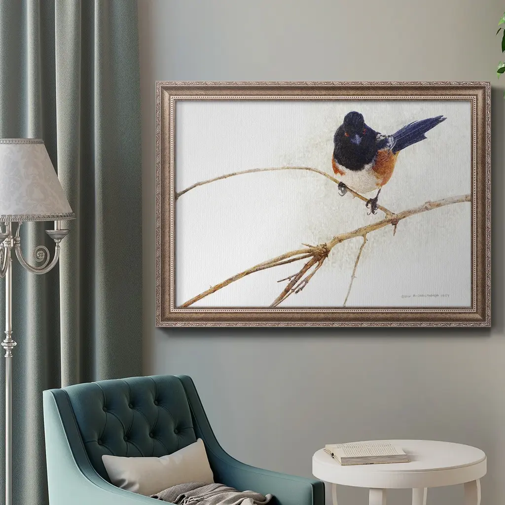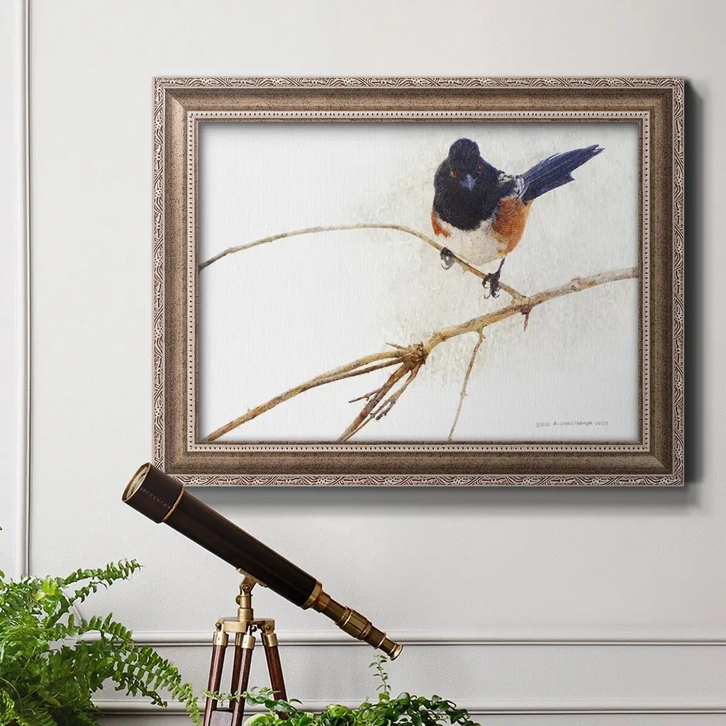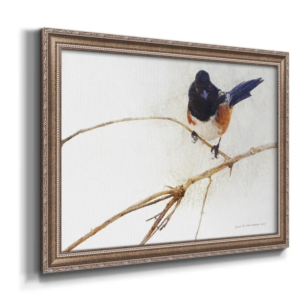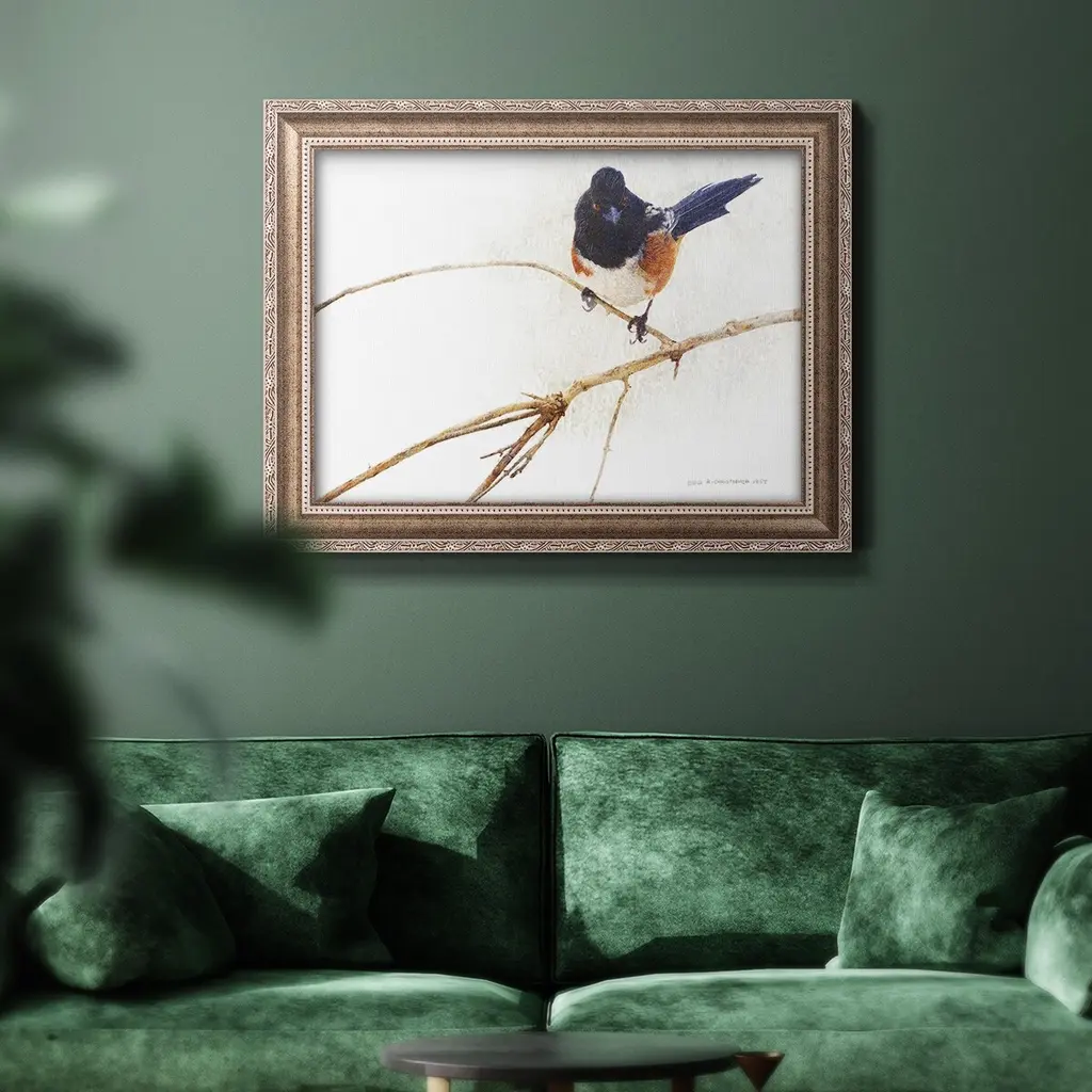 On the Branch IV Premium Framed Canvas- Ready to Hang A Premium Framed Canvas created to last. Framed in distressed wood and available in an array of sizes and colors Featuring a beveled a solid wood stretcher bar, each piece comes ready to hand 3 SIZES AVAILABLE 16''X20'' - Overall Size 18'X27'' - Overall Size 24''x36'' - Overall Size Each piece is made to order. Each piece comes with hanging hardware. Made in the USA Ready to Hang Giclee Paper Print Acrylic Glass Beveled Matt Board