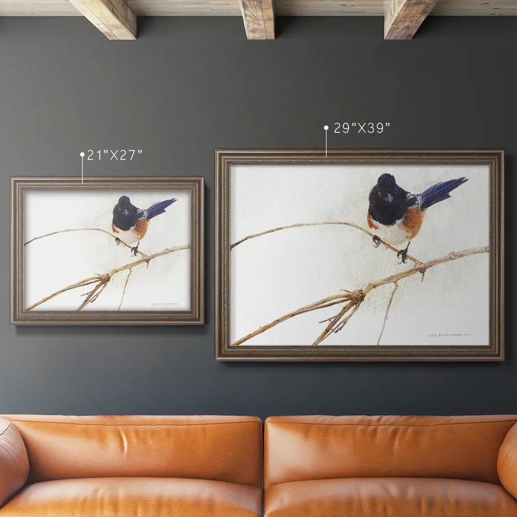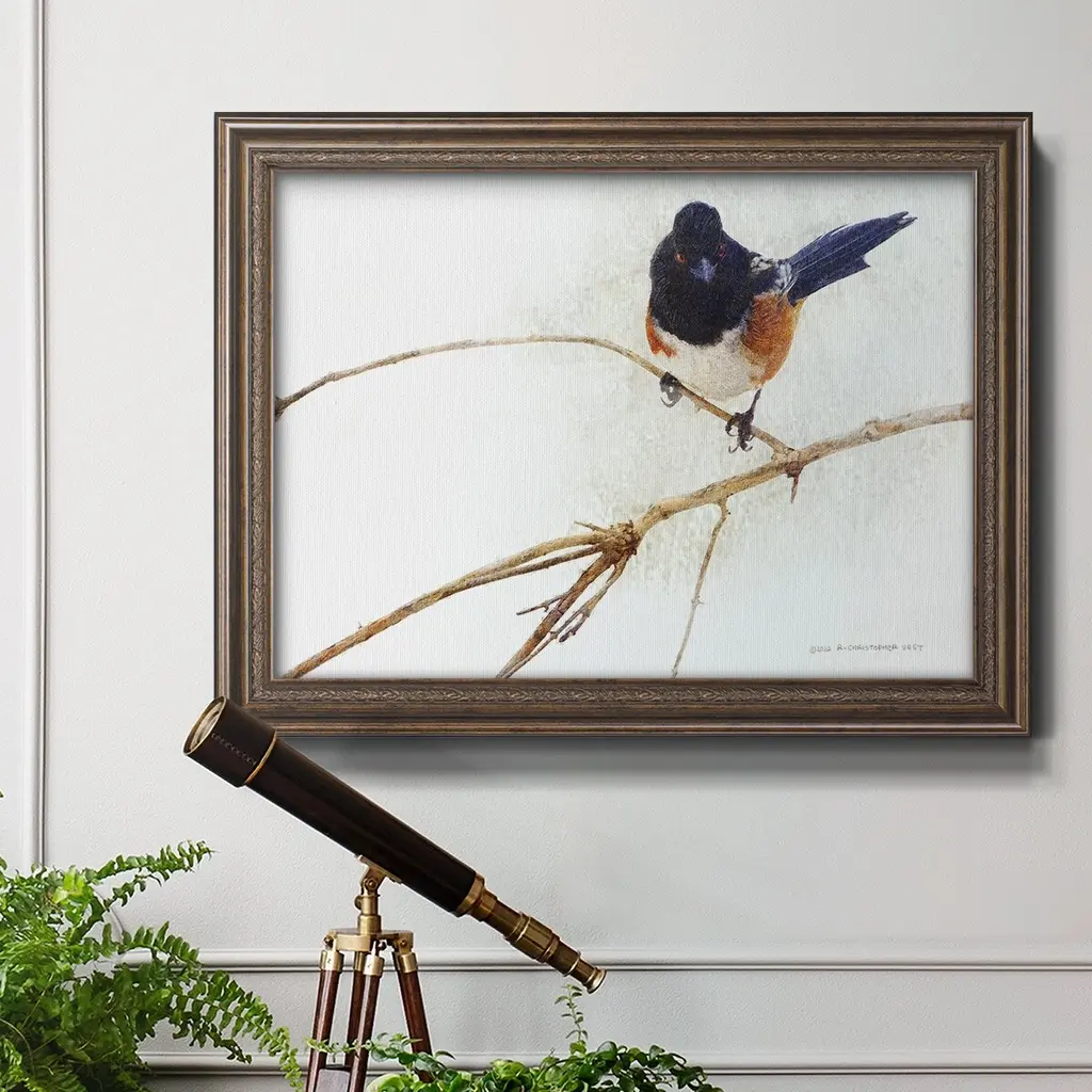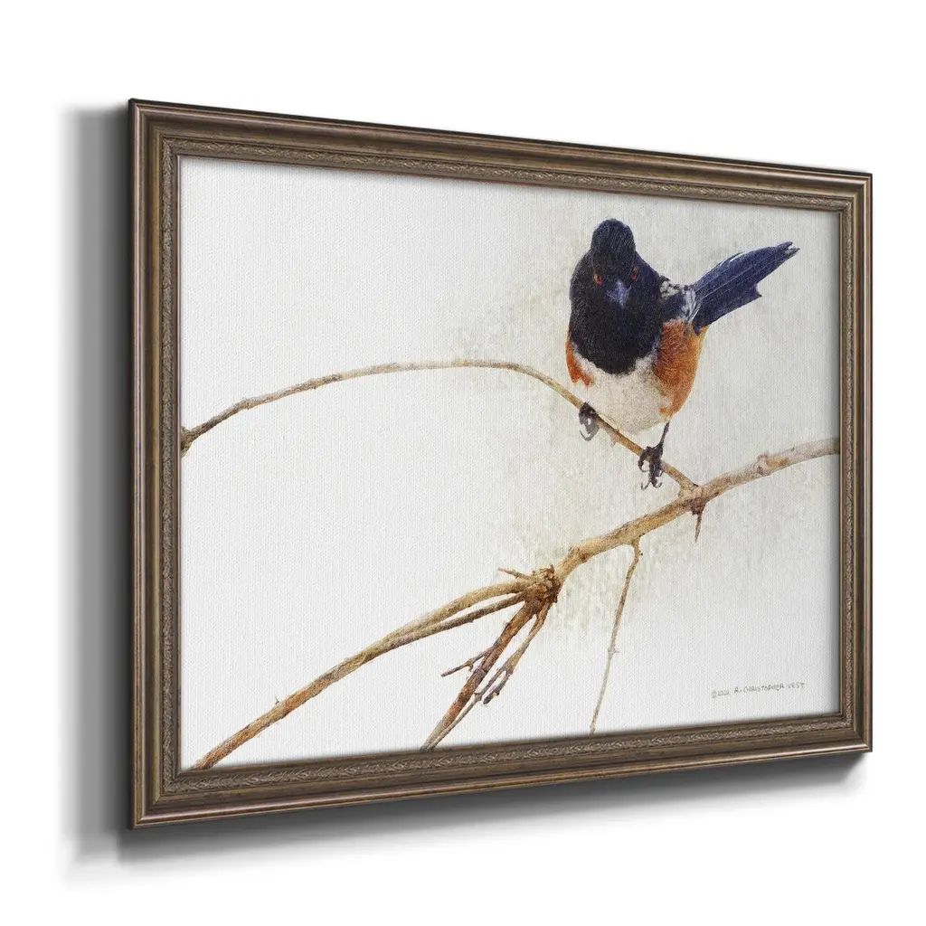 On the Branch IV Premium Framed Canvas- Ready to Hang A Premium Framed Canvas created to last. Framed in distressed wood and available in an array of sizes and colors Featuring a beveled a solid wood stretcher bar, each piece comes ready to hand 3 SIZES AVAILABLE 16''X20'' - Overall Size 18'X27'' - Overall Size 24''x36'' - Overall Size Each piece is made to order. Each piece comes with hanging hardware. Made in the USA Ready to Hang Giclee Paper Print Acrylic Glass Beveled Matt Board
