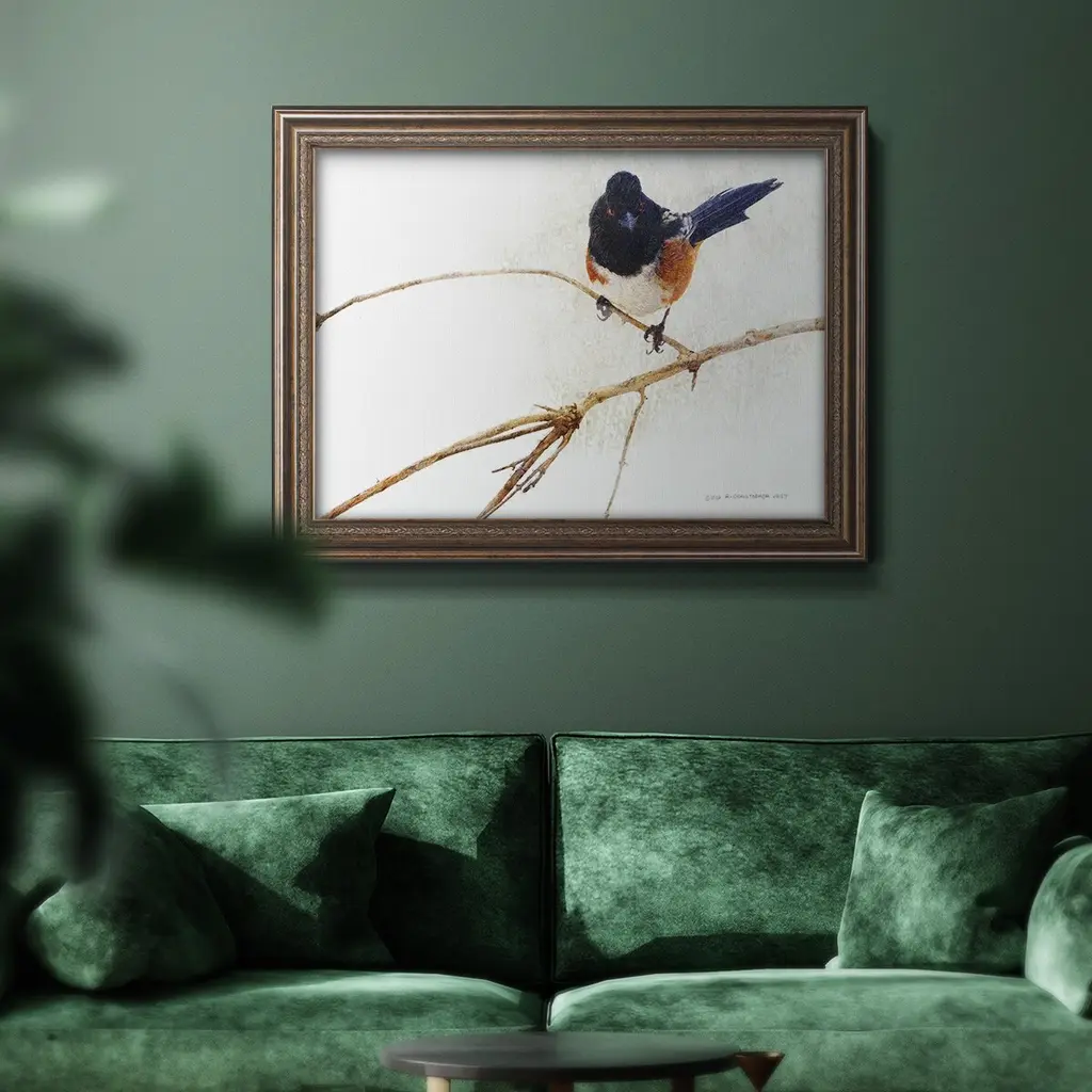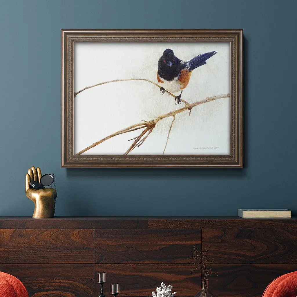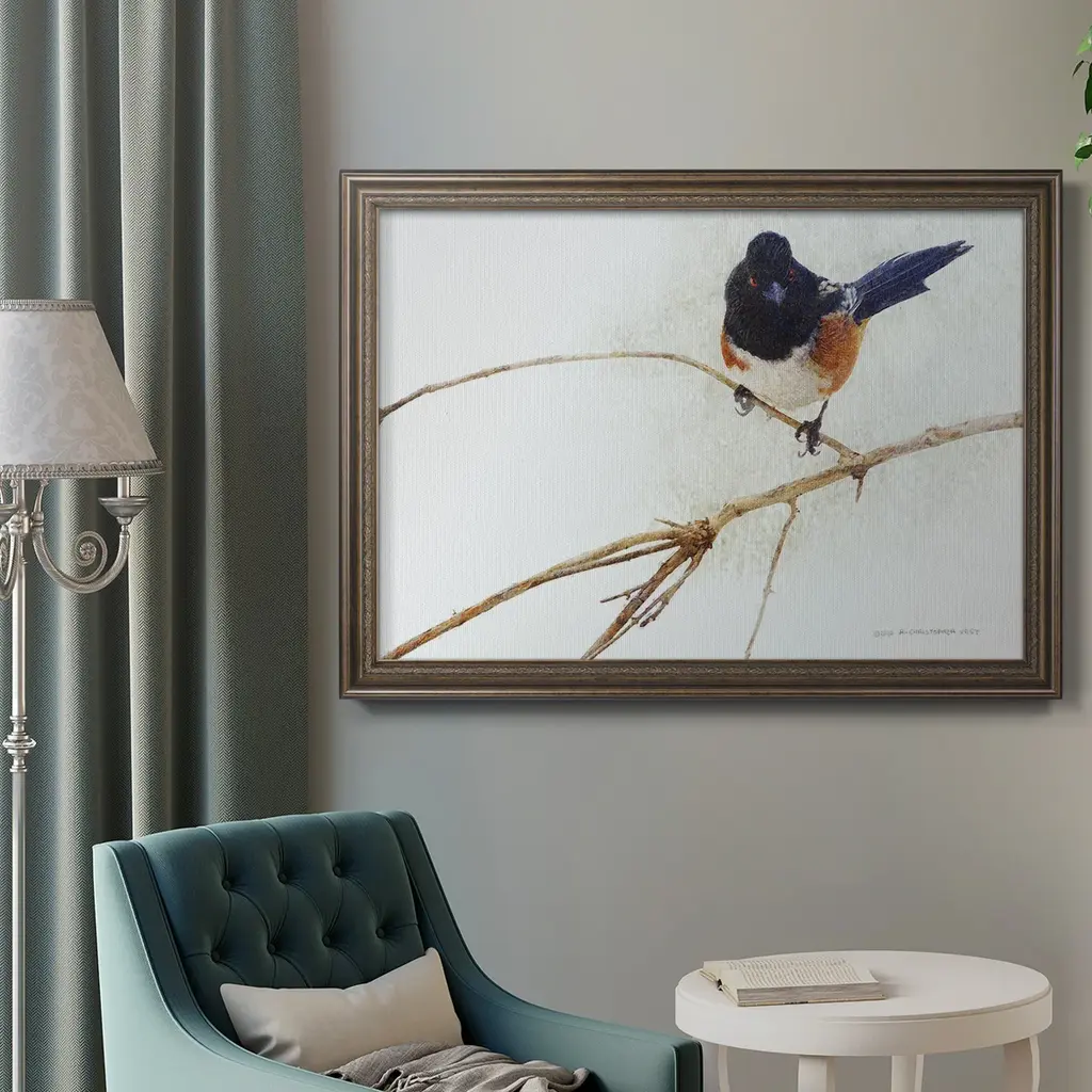 On the Branch IV Premium Framed Canvas- Ready to Hang A Premium Framed Canvas created to last. Framed in distressed wood and available in an array of sizes and colors Featuring a beveled a solid wood stretcher bar, each piece comes ready to hand 3 SIZES AVAILABLE 16''X20'' - Overall Size 18'X27'' - Overall Size 24''x36'' - Overall Size Each piece is made to order. Each piece comes with hanging hardware. Made in the USA Ready to Hang Giclee Paper Print Acrylic Glass Beveled Matt Board