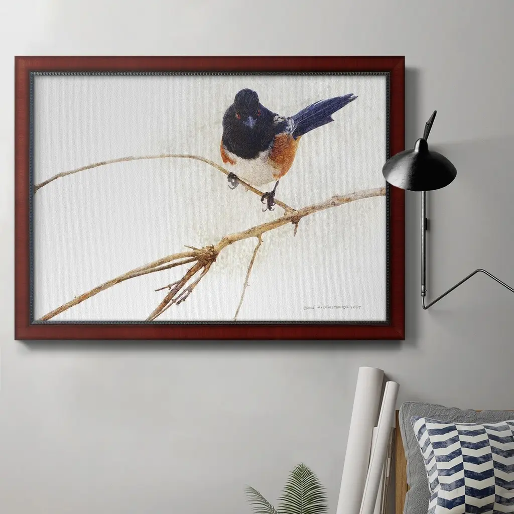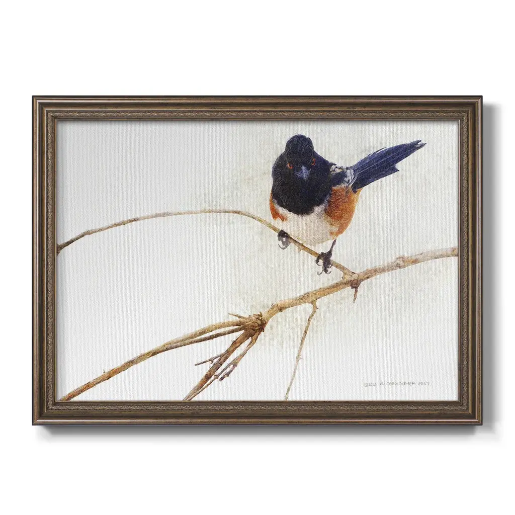 On the Branch IV Premium Framed Canvas- Ready to Hang A Premium Framed Canvas created to last. Framed in distressed wood and available in an array of sizes and colors Featuring a beveled a solid wood stretcher bar, each piece comes ready to hand 3 SIZES AVAILABLE 16''X20'' - Overall Size 18'X27'' - Overall Size 24''x36'' - Overall Size Each piece is made to order. Each piece comes with hanging hardware. Made in the USA Ready to Hang Giclee Paper Print Acrylic Glass Beveled Matt Board