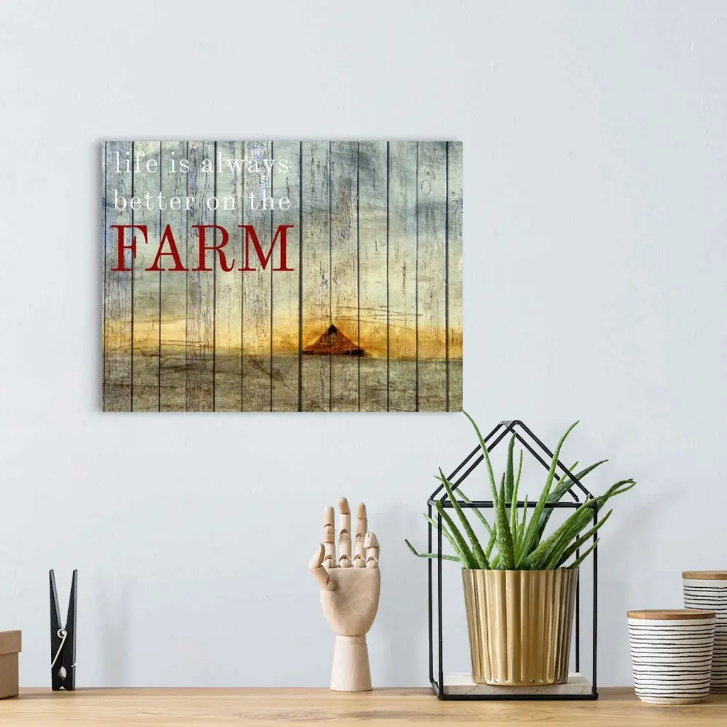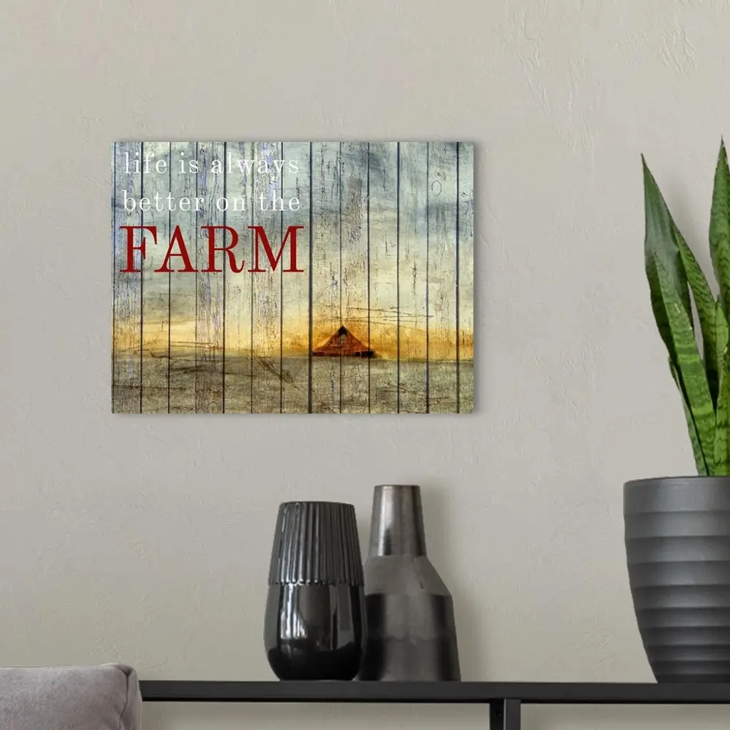 Painting of a farm scene with a red barn and golden horizon with the phrase "Life is always better on the farm" written on the side, all on a distressed wood paneled background.