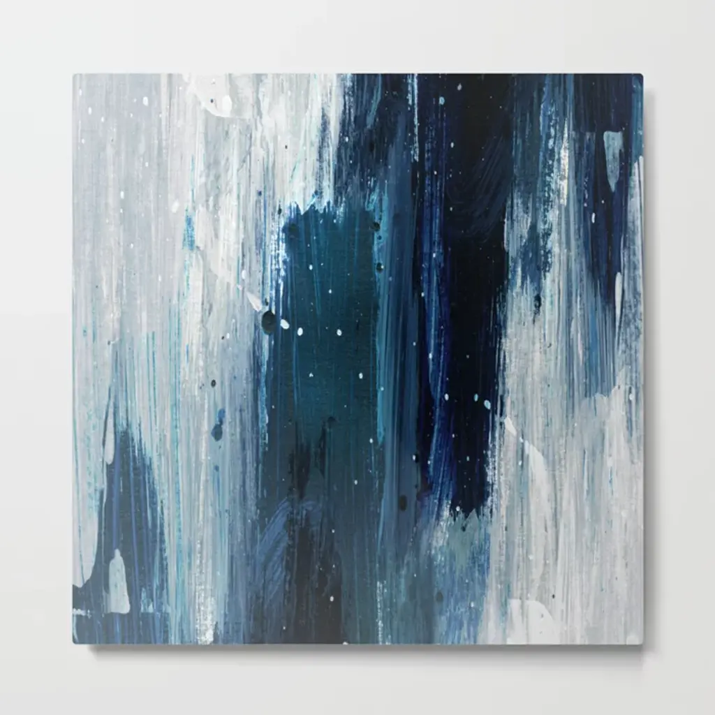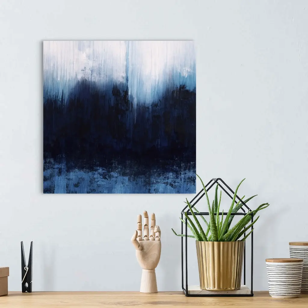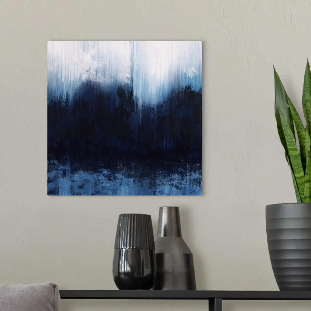 Contemporary abstract painting using dark blue and gray tones in a vertically blurred motion.