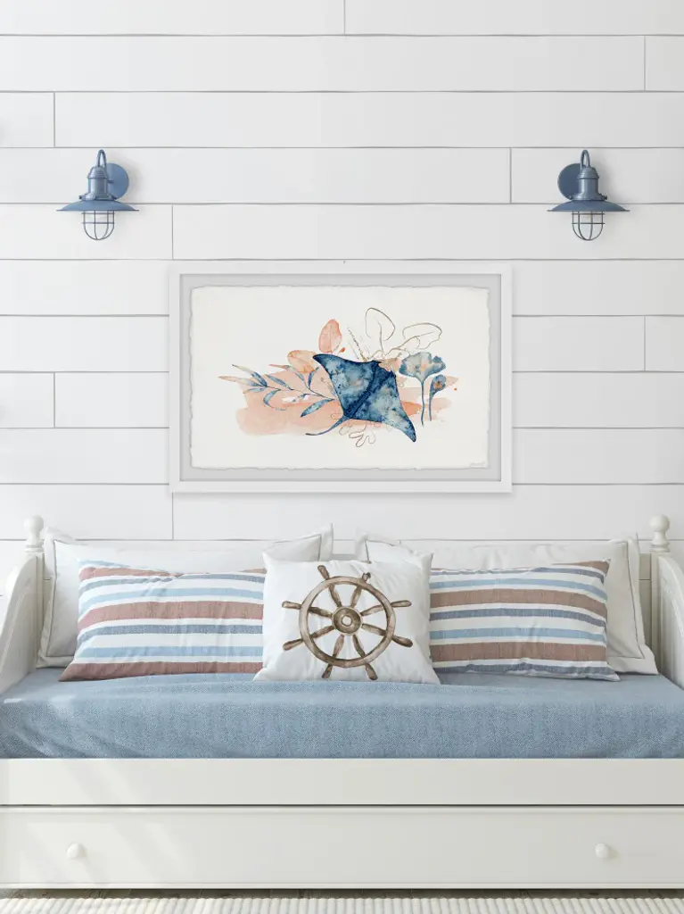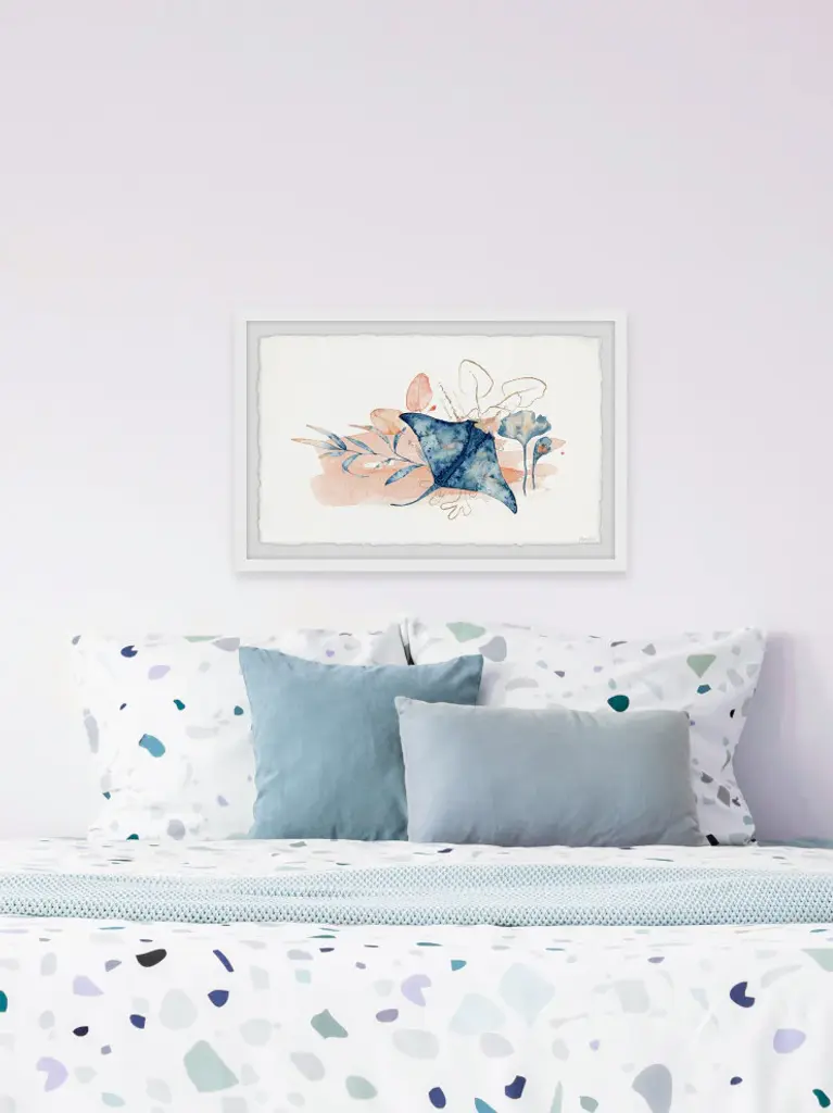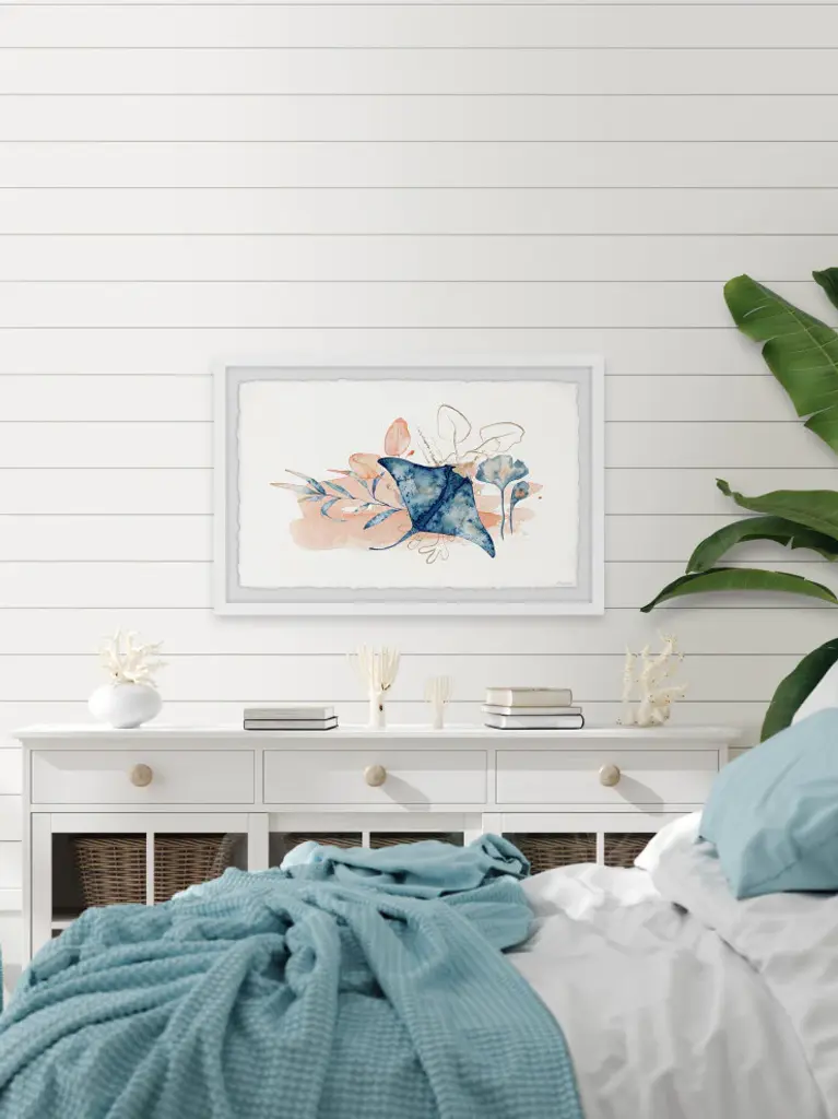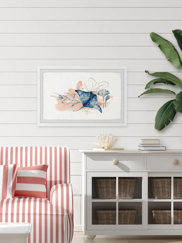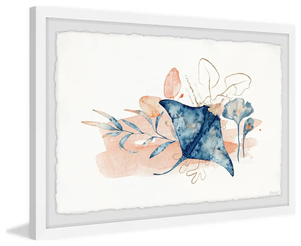 Beautiful ocean plant life and a stunning blue stingray intermingle in this coastal peach and blue watercolor painting print. Proudly printed in the USA, this piece is printed on high quality archive paper and professionally hand-framed. With wall-mounting hooks included, this artful accent is ready to hang up as soon as it reaches your front door.- Top quality Giclee print on high resolution Archive Paper- Hand cut deckled edges- High quality durable non-warping frame- Finished under shatter resistant plexiglass- Arrives ready to hang- Includes a certificate of authenticity- Printed in the USA