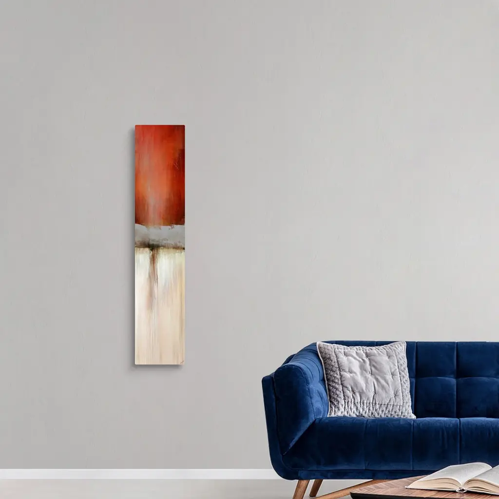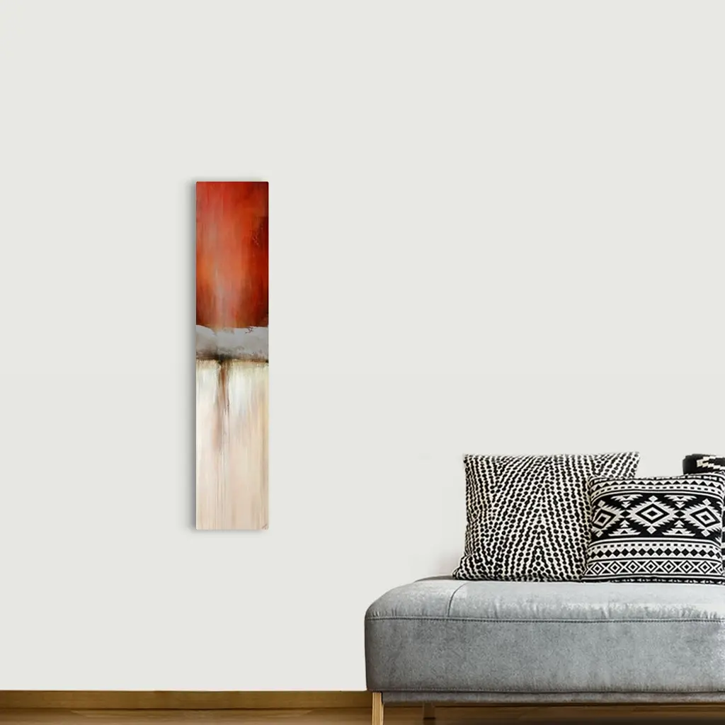 Abstract painting with a composition of maroon red, cool gray, and tan divided in three sections.