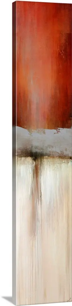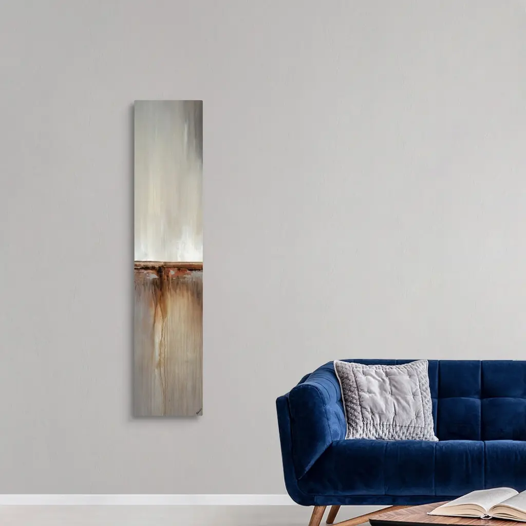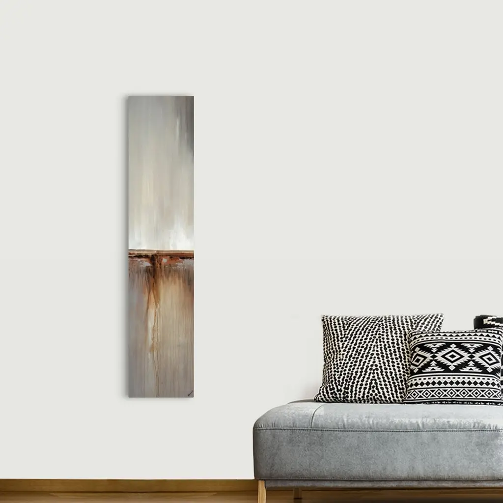 Abstract painting with a composition of cool grays and tan divided in three sections.
