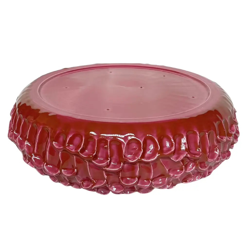 This glazed ceramic centerpiece is a unique piece, perfect as a centerpiece or decorative tray. Finished with a gold glaze, it reveals warm mauve tones through oxidation. Created by Daria Dazzan in her Milan studio, it blends design, ceramics, and sculpture. Handmade without molds, it's part of the 'Onda series', inspired by flowing waves. Each plate may have slight variations in color and size, making it an exclusive, collectible artwork.