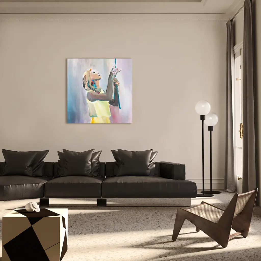 Exploring the concept of identity and personality, which nowadays draws many individuals to live a solitary life embedded in a virtual reality brought by technology, this painting features stunning evocative shades symbolizing a dialogue with the past. Please consult the Concierge for further information. This is a unique piece of art. Delivered with a certificate of authenticity. Frame not included.