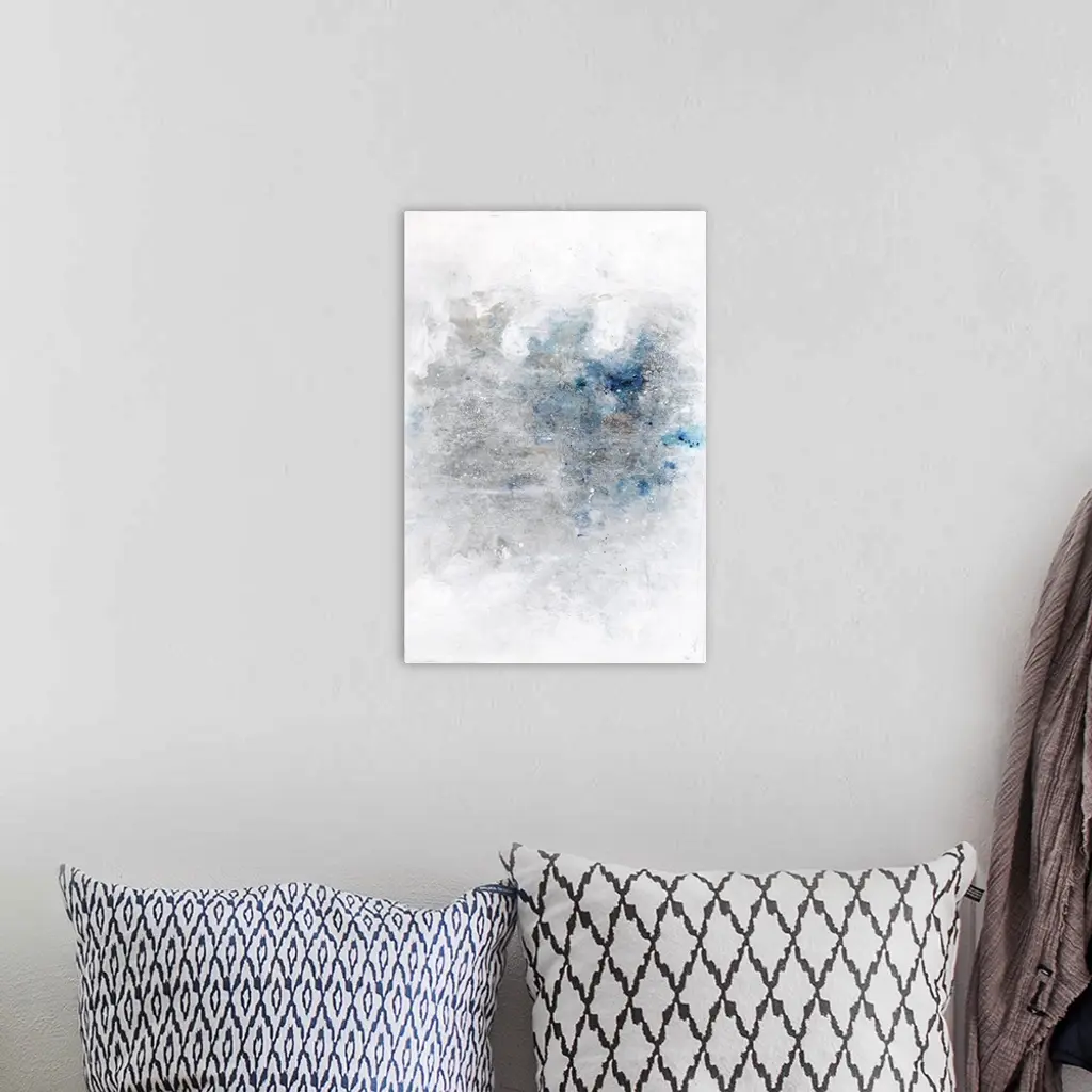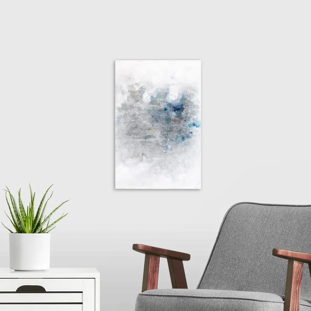 Large contemporary abstract artwork with silver and blue hues in the middle of a white background with faint circles popping up in the center and stacked in rows.