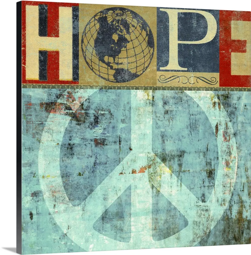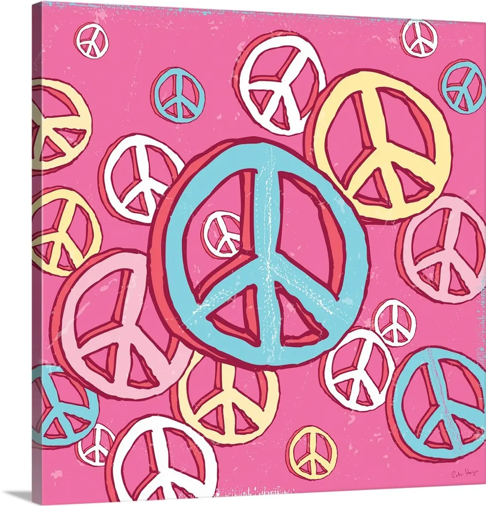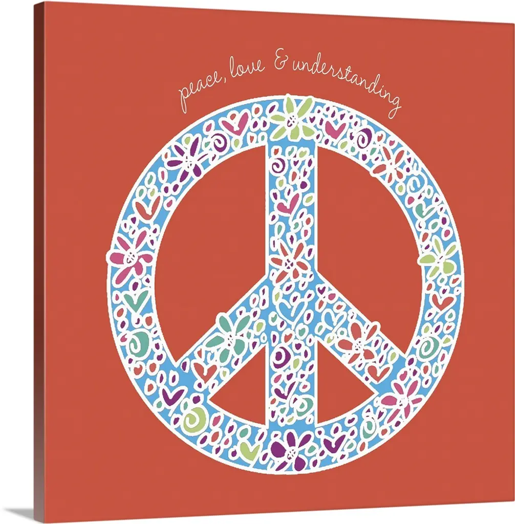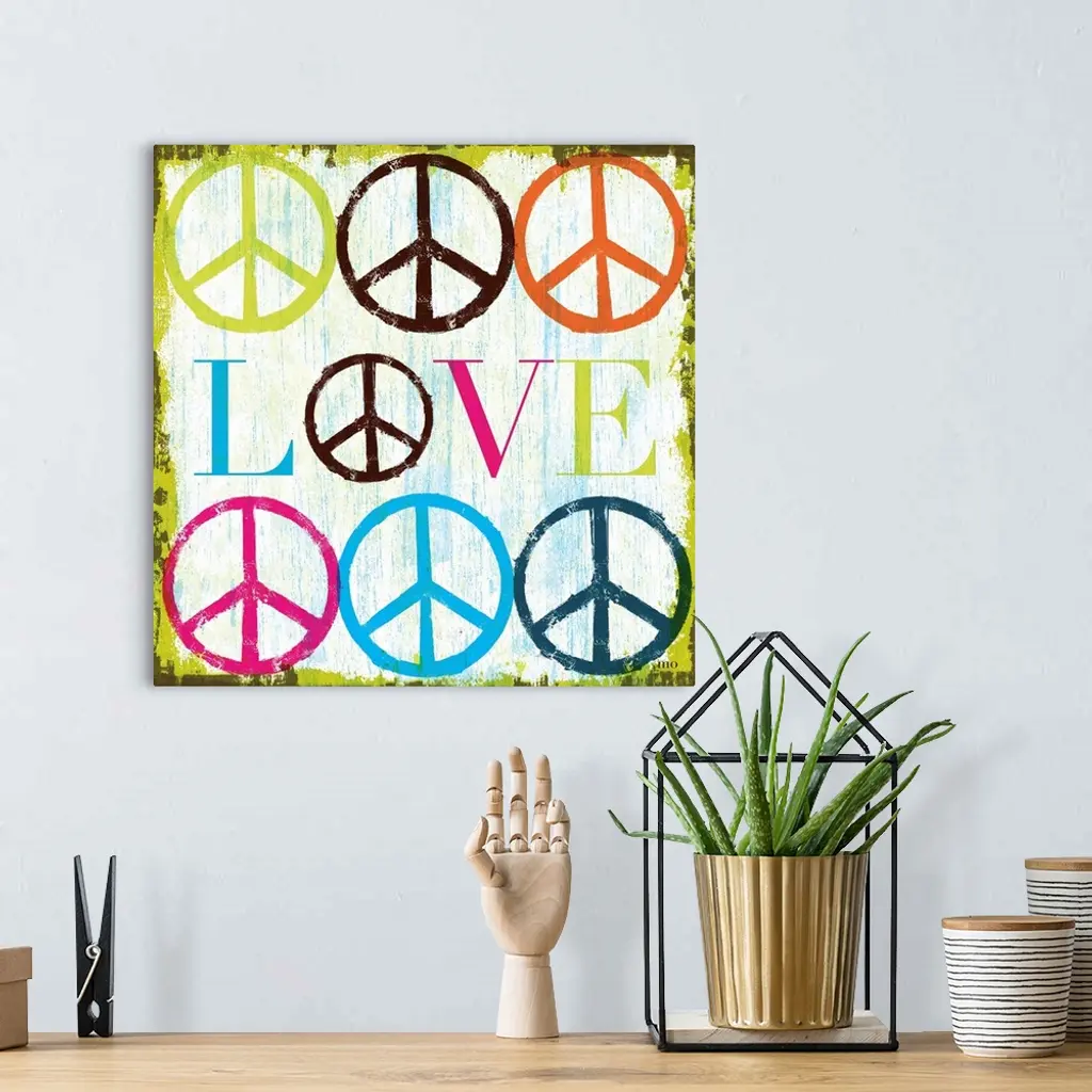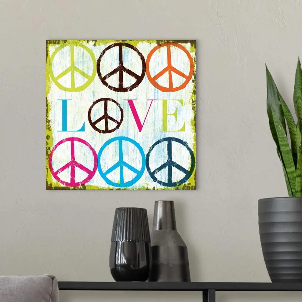 Retro artwork of the word "LOVE" surrounded by colorful peace sign symbols.