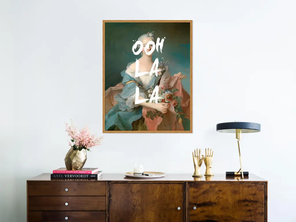 DESCRIPTION: Ooh La La by Lara Fowler in Gold Framed Paper, Medium Art Print SPECIFICATIONS: Type: Framed Paper. Framed Size (in): 28.5x36. Orientation: Vertical. Flush/Float/Matted: Flush. Frame Color: Gold. Hanging Hardware: Picture Perfect. FRAMING: Each art work arrives framed and ready to hang. We use handmade frames with a plexiglass glazing front, because it offers less glare than standard glass. At this time, we only offer framed prints. ARTIST BIO: Lara Fowler is a British artist who creates quirky art prints with a twist.