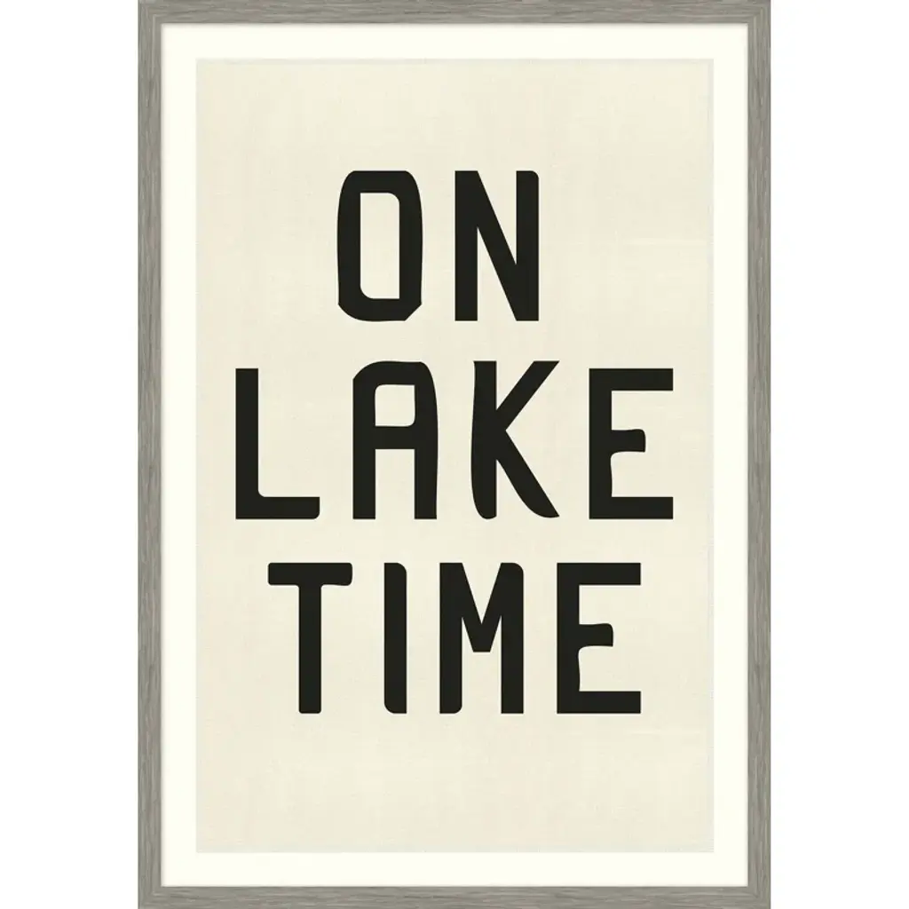 Variations of graphic lettering on hand frayed raw canvas all embrace the same idea: it’s time for more time at the lake. Choose a phrase and print size from the collection, each one framed in a woodgrain shadowbox for gallery-style dimension.