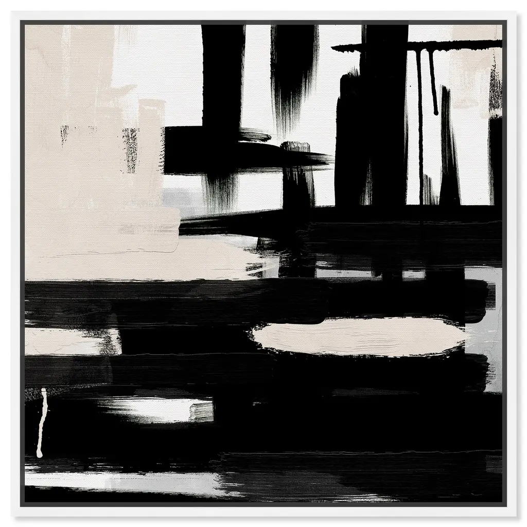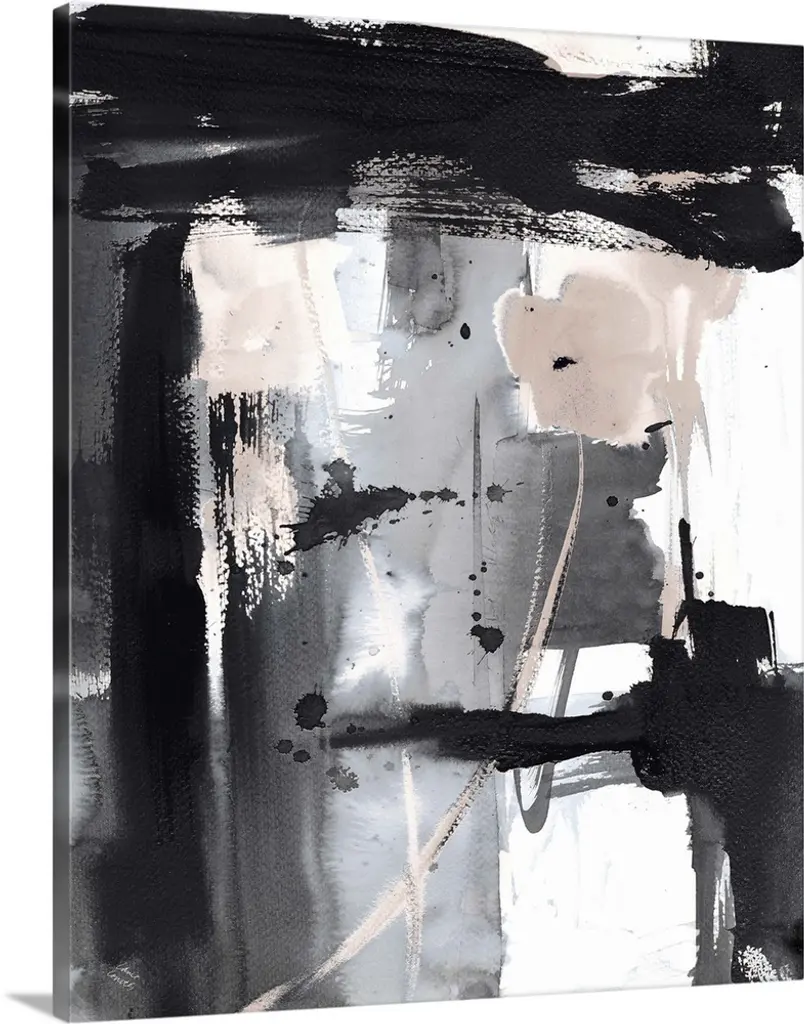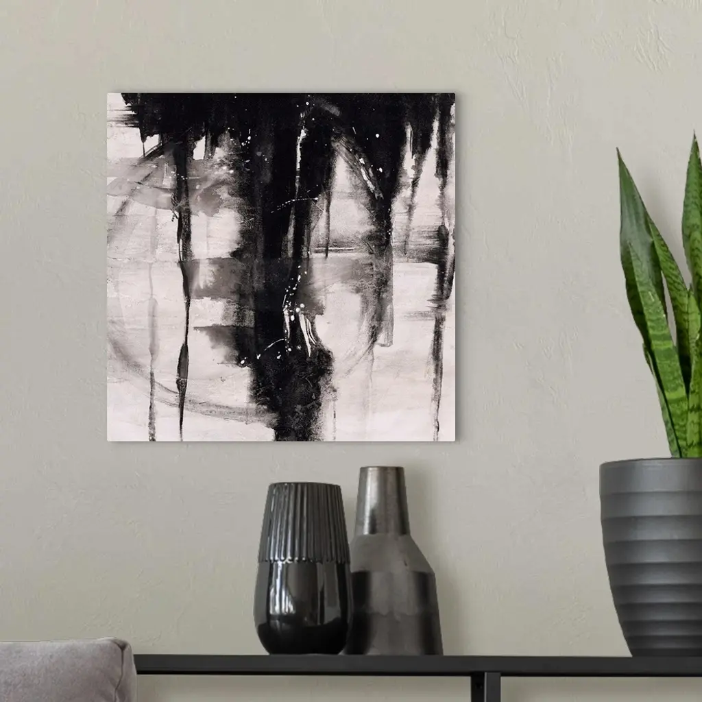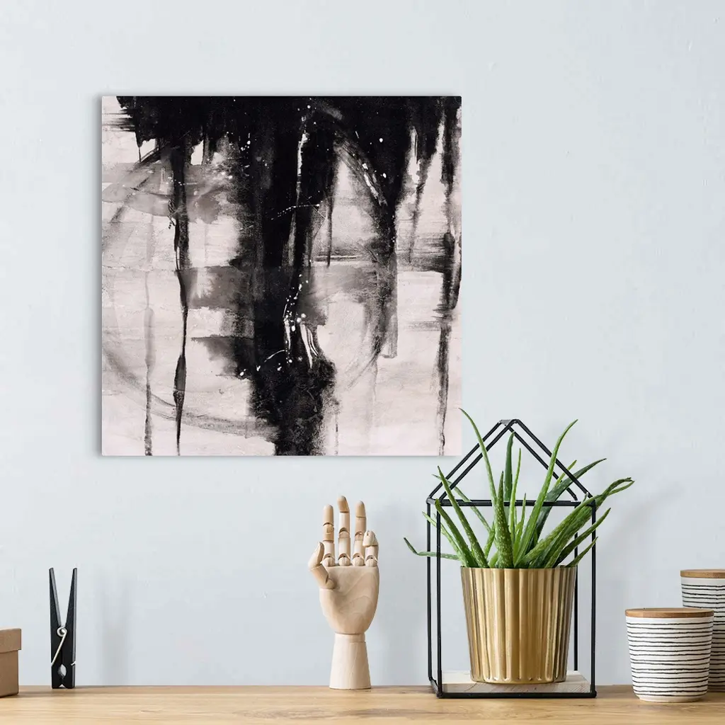 Abstract painting using black paint dripping down from top of image, against a gray toned background.