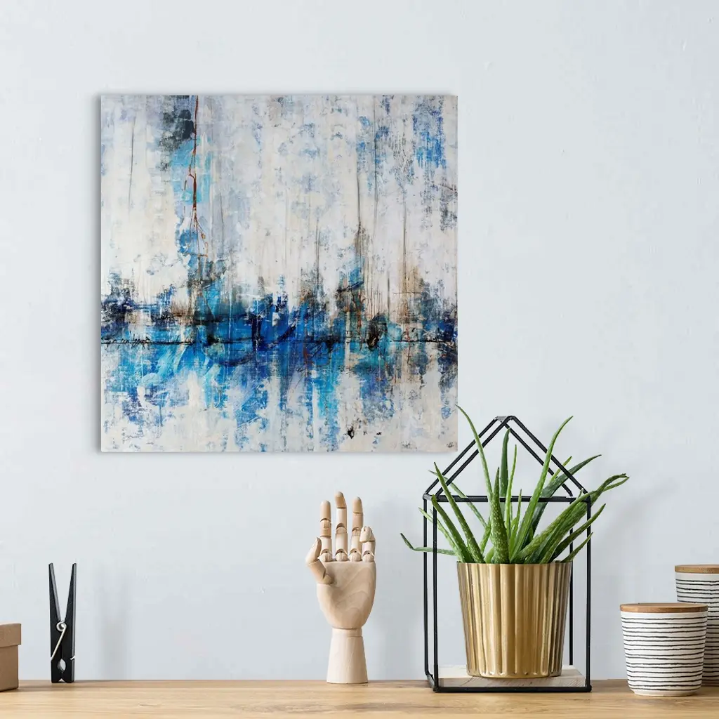 Abstract painting of a city skyline in cool tones, reflecting in the water in the foreground. Painted with overlapping colors and rough brush strokes.