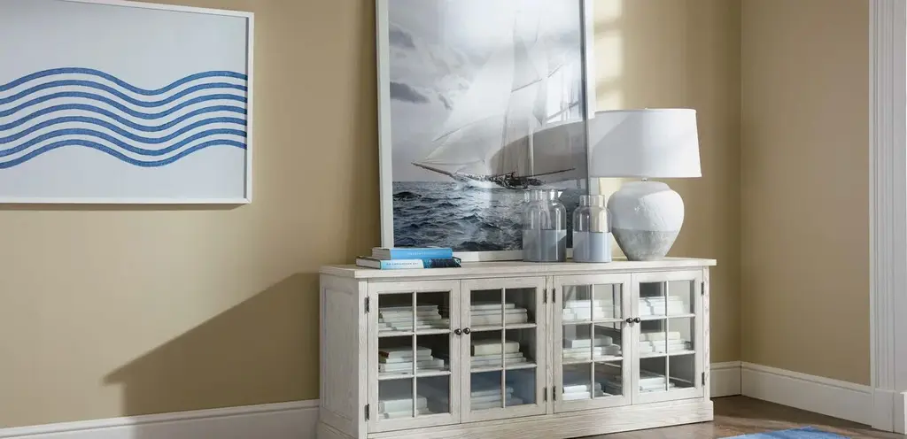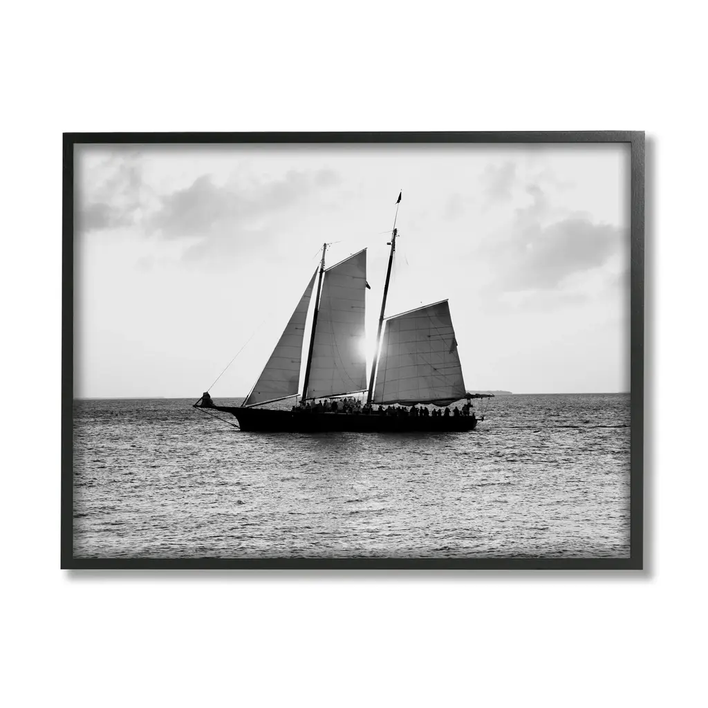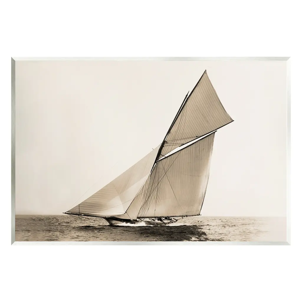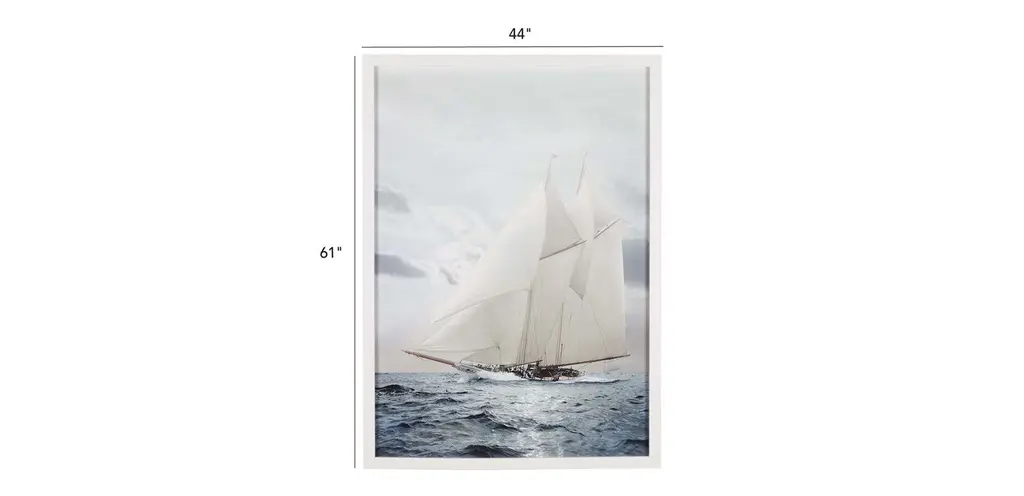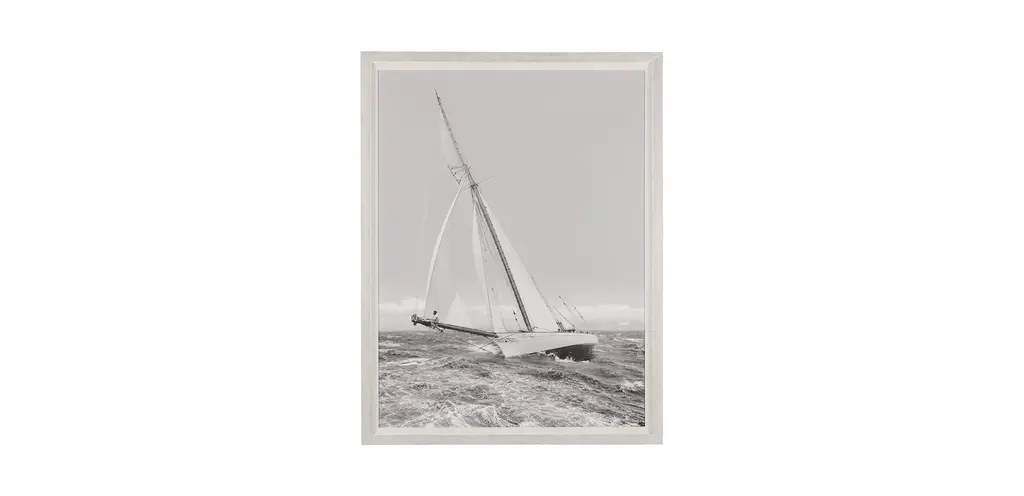 An inspiring portrayal of a majestic vessel that conveys epic stillness. The photograph has a painterly quality: The choppy sea and poised ship with voluminous sails, under a luminous sky, are so perfectly balanced that the work feels composed by hand. Generously scaled, this sailboat art commands a central placement either above a mantel or behind a handsome desk, or in a spectacular position in your living room.