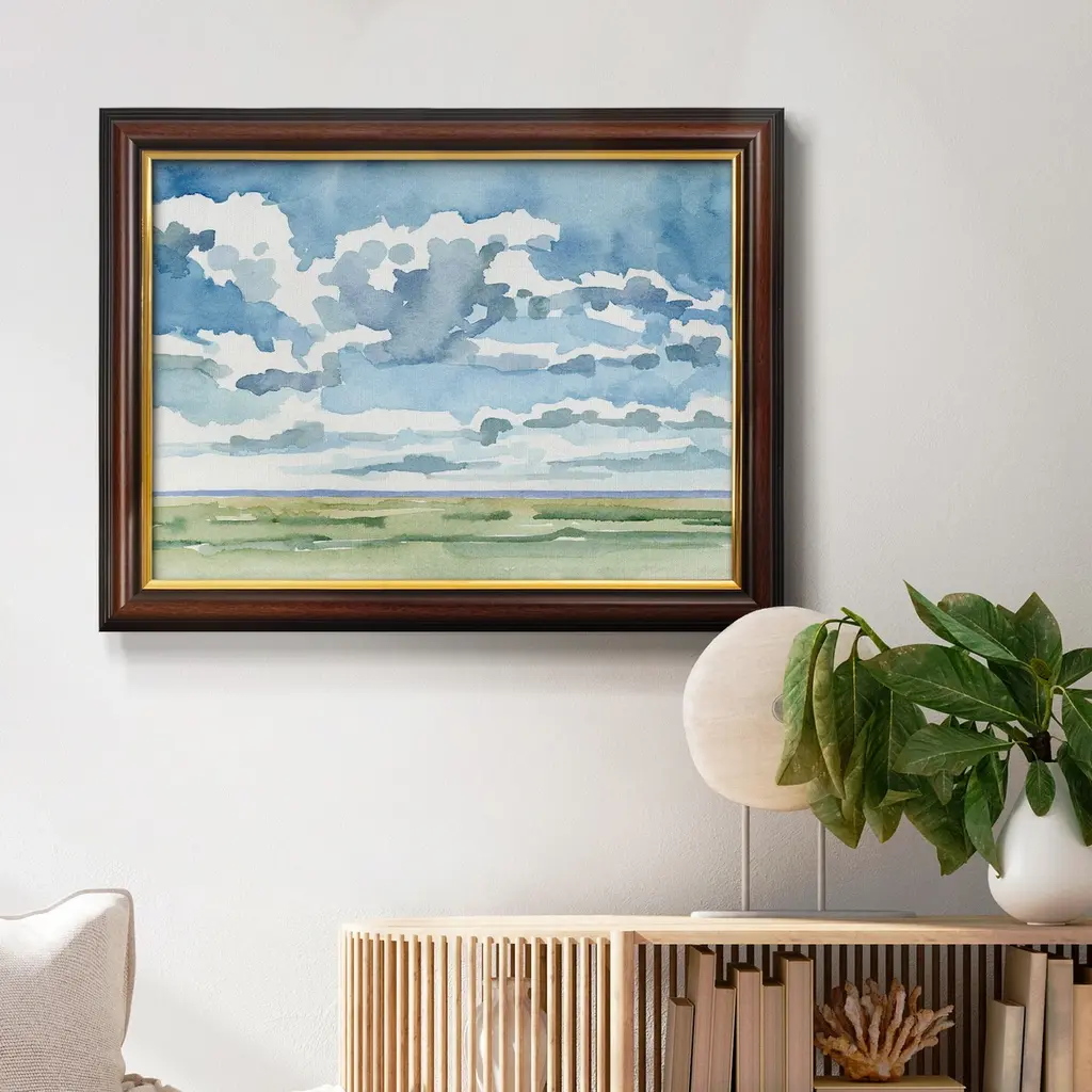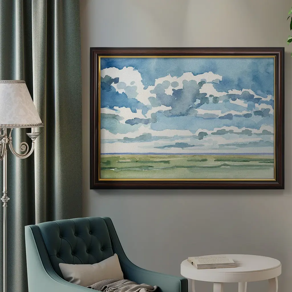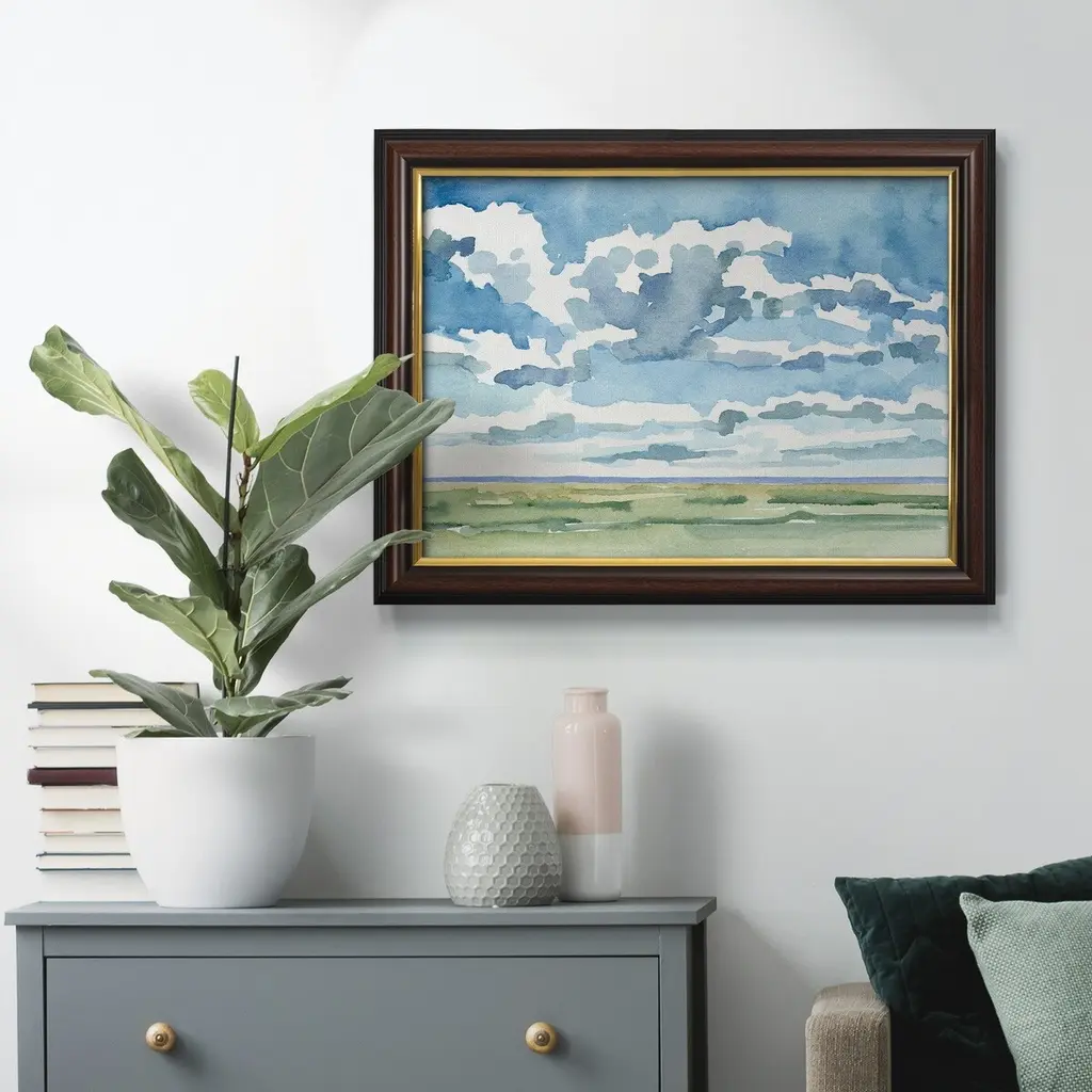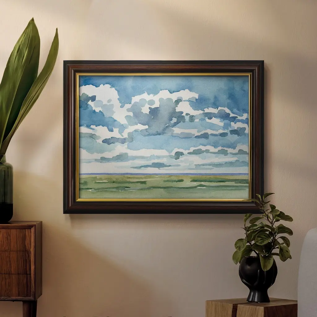 Open Sky Study I Premium Framed Canvas- Ready to Hang A Premium Framed Canvas created to last. Framed in distressed wood and available in an array of sizes and colors Featuring a beveled a solid wood stretcher bar, each piece comes ready to hand 3 SIZES AVAILABLE 16''X20'' - Overall Size 18'X27'' - Overall Size 24''x36'' - Overall Size Each piece is made to order. Each piece comes with hanging hardware. Made in the USA Ready to Hang Giclee Paper Print Acrylic Glass Beveled Matt Board
