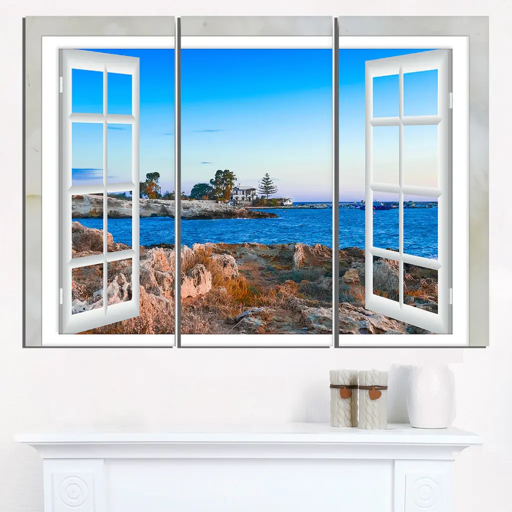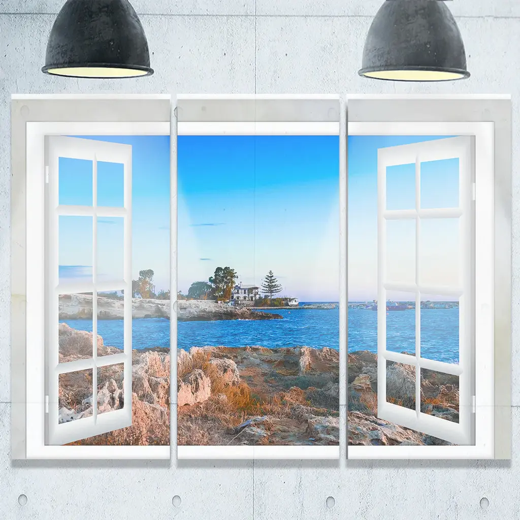 "Open Window To Blue Seashore" Oversized Metal Wall Art, 3 Panels, 36"x28"