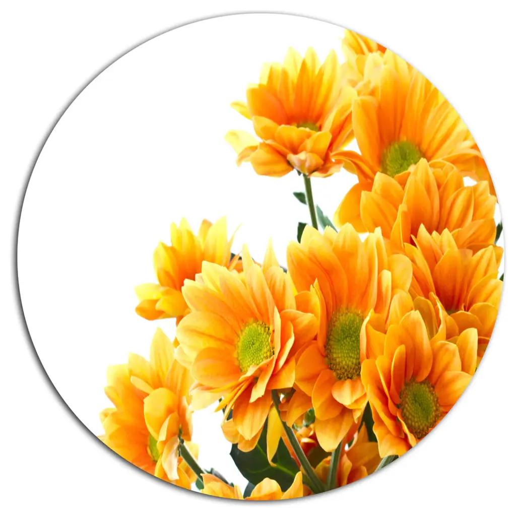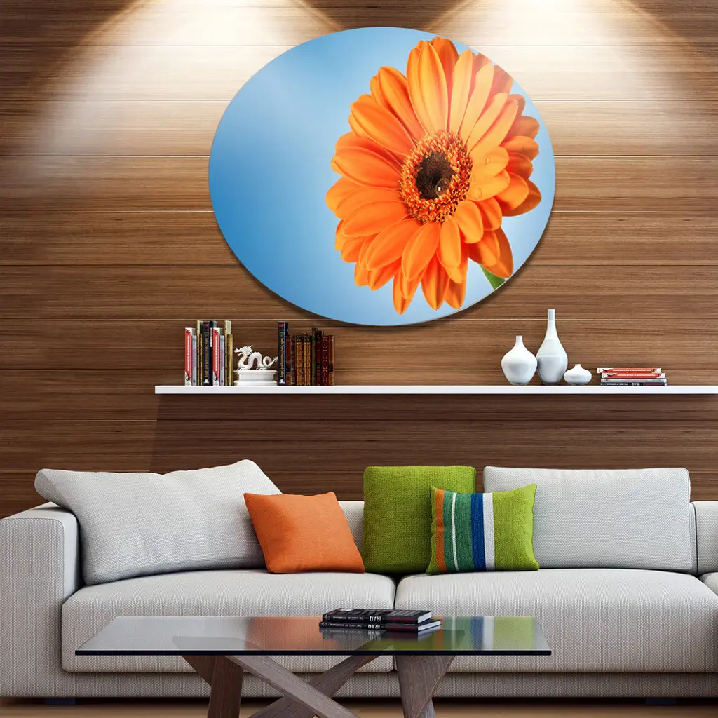 Bring Contemporary Abstraction to your home with this large Circle Metal wall art. This Orange Daisy Gerbera Flower on Blue Metal Artwork makes it the focal point of any room or office. - White Gloss Coating ensures colors are extra vibrant with light reflection.- Aluminum grade Sheet Metal with 1 inch mounting frame on the back giving the illusion that the artwork is floating on the wall..- Mounting Brackets are included along with instructions.- High Quality Digital images are created directly into a glossy aluminum panel producing a stunning and captivating print into the glossy finish of the metal.- Water, Fire and Scratch resistant HD Aluminum panels.- Looks better than any photo paper and guaranteed to last at least 20 years- Easy to clean with a microfiber cloth. Colors are far superior to regular Canvas Art. - Easy to Hang