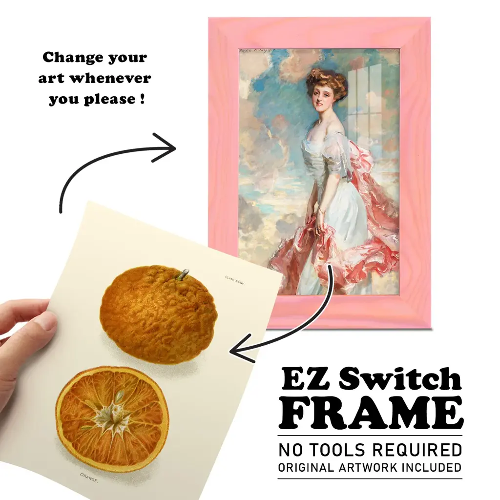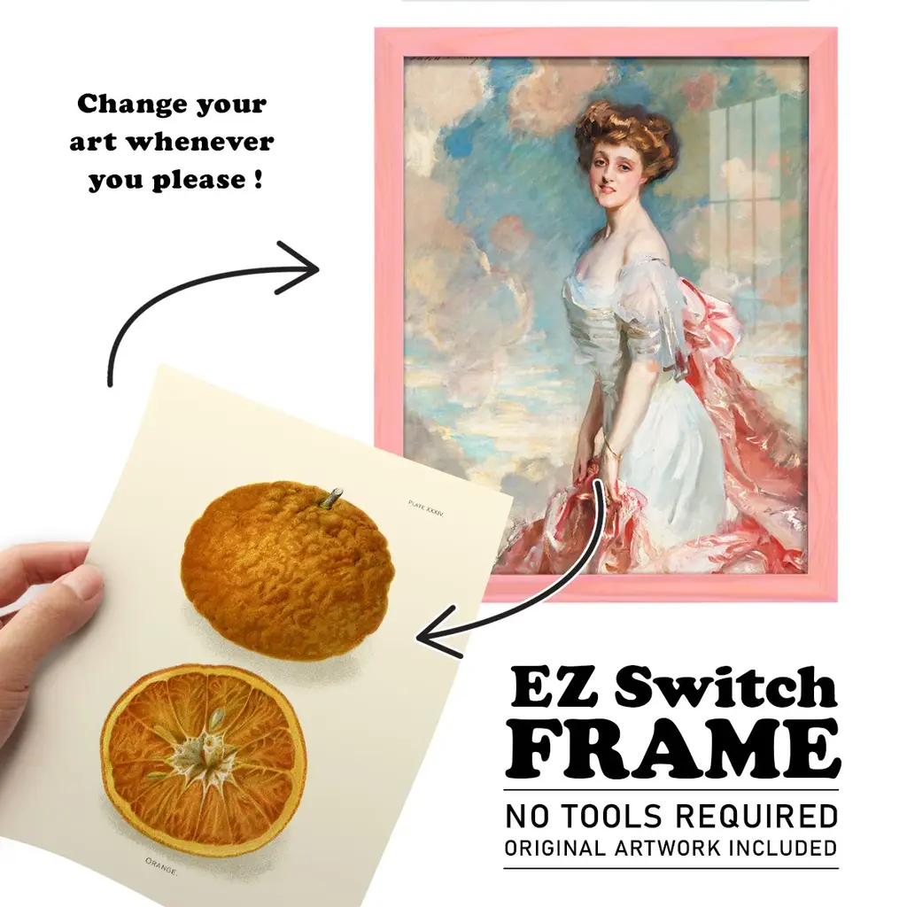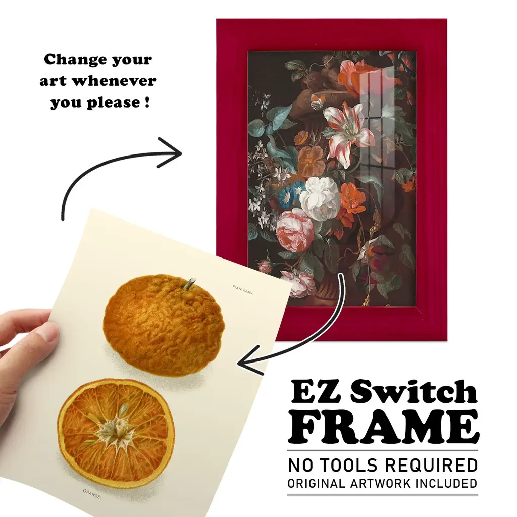 Orange -EZ SWITCH Framed Print w/glass-Cherry Red A delightful, framed print. Featuring a solid wood frame with real wood glass. This premium print is giclee quality. In addition, every frame features a removable back and table top stand. This allows you to change your art in the future or to just stand the art on a table for a new look. We are sure you'll enjoy our new series of EZ SWITCH Framed Art. Solid Wood Frame Real Glass Removable / Replaceable Art Built in Tabletop Stand Sizes range from 4x6 up to 12x15 - buy just one or pair them up as sets as you see fit.