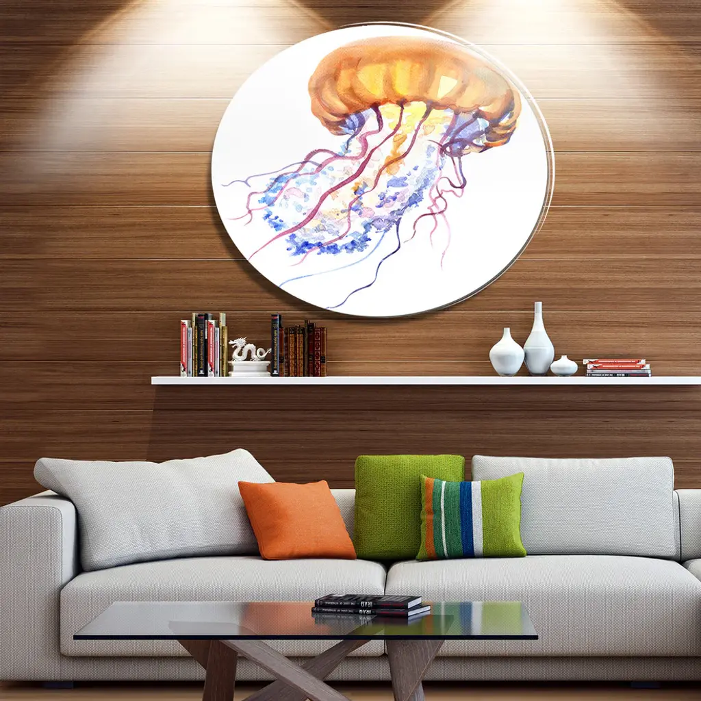 Bring Contemporary Abstraction to your home with this large Circle Metal wall art. This Orange Ocean Water Jellyfish Metal Artwork makes it the focal point of any room or office. - White Gloss Coating ensures colors are extra vibrant with light reflection.- Aluminum grade Sheet Metal with 1 inch mounting frame on the back giving the illusion that the artwork is floating on the wall..- Mounting Brackets are included along with instructions.- High Quality Digital images are created directly into a glossy aluminum panel producing a stunning and captivating print into the glossy finish of the metal.- Water, Fire and Scratch resistant HD Aluminum panels.- Looks better than any photo paper and guaranteed to last at least 20 years- Easy to clean with a microfiber cloth. Colors are far superior to regular Canvas Art. - Easy to Hang