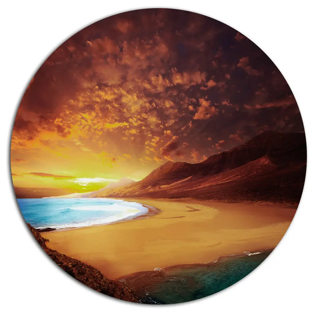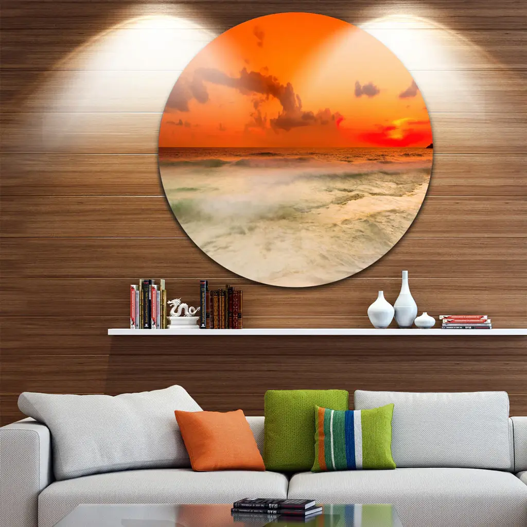 Bring Contemporary Abstraction to your home with this large Circle Metal wall art. This Orange Sky and Wide Sandy Beach Metal Artwork makes it the focal point of any room or office. - White Gloss Coating ensures colors are extra vibrant with light reflection.- Aluminum grade Sheet Metal with 1 inch mounting frame on the back giving the illusion that the artwork is floating on the wall..- Mounting Brackets are included along with instructions.- High Quality Digital images are created directly into a glossy aluminum panel producing a stunning and captivating print into the glossy finish of the metal.- Water, Fire and Scratch resistant HD Aluminum panels.- Looks better than any photo paper and guaranteed to last at least 20 years- Easy to clean with a microfiber cloth. Colors are far superior to regular Canvas Art. - Easy to Hang